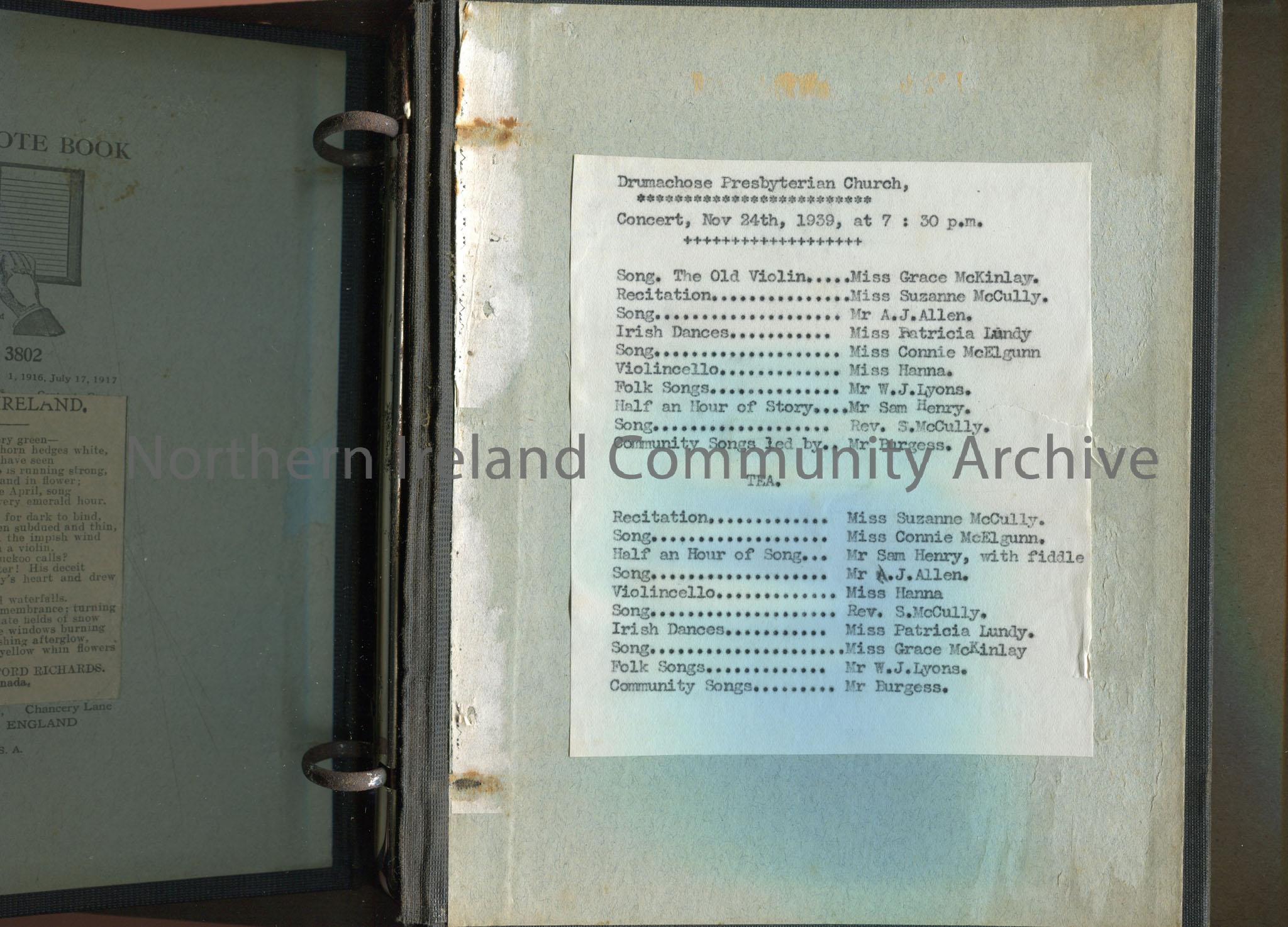 Black ring binder folder labelled 'Lectures (Alphabetical)' on spine. ' Postage 1/5d due to me 26/5/36' handwritten in pencil top right corner of inside corner. Poem cut from newspaper stuck to inside cover titled, 'April in Ireland' from Beresford Richards, Athabasca, Alberta, Canada. Typed page titled, 'Drumachose Presbyterian Church, Concert, Nov 24th, 1939, at 7:30pm'. It is an itinerary of events during the evening and the names of those performing. Sam Henry is noted as 'half an hour of story' and 'half an hour of song with fiddle'.