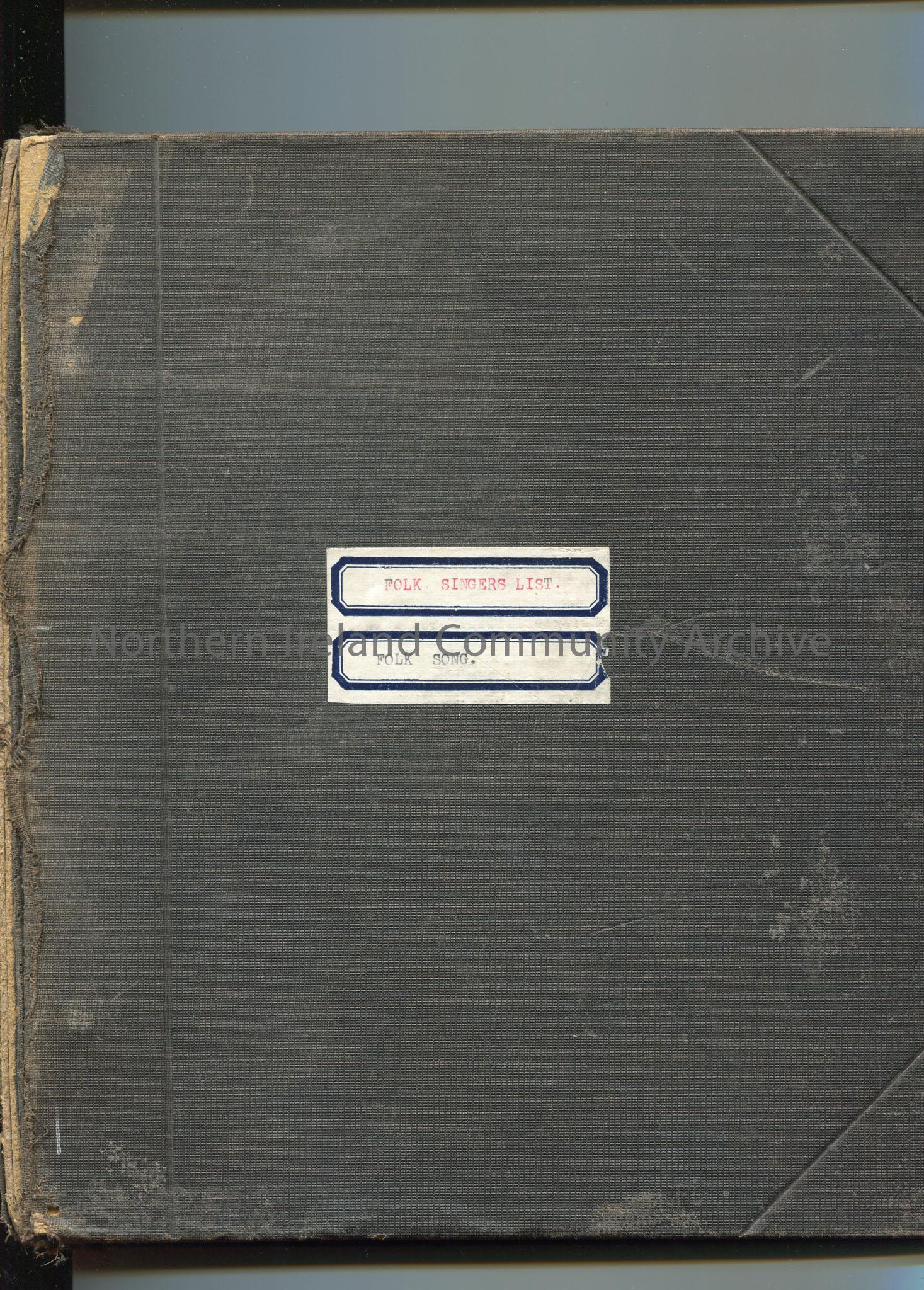 Black ring binder folder – ‘National Simplex Notebook’ and ‘Strain Belfast’ red shamrock sticker on inside cover. ‘Folk Singers List. Folk Song’ label…