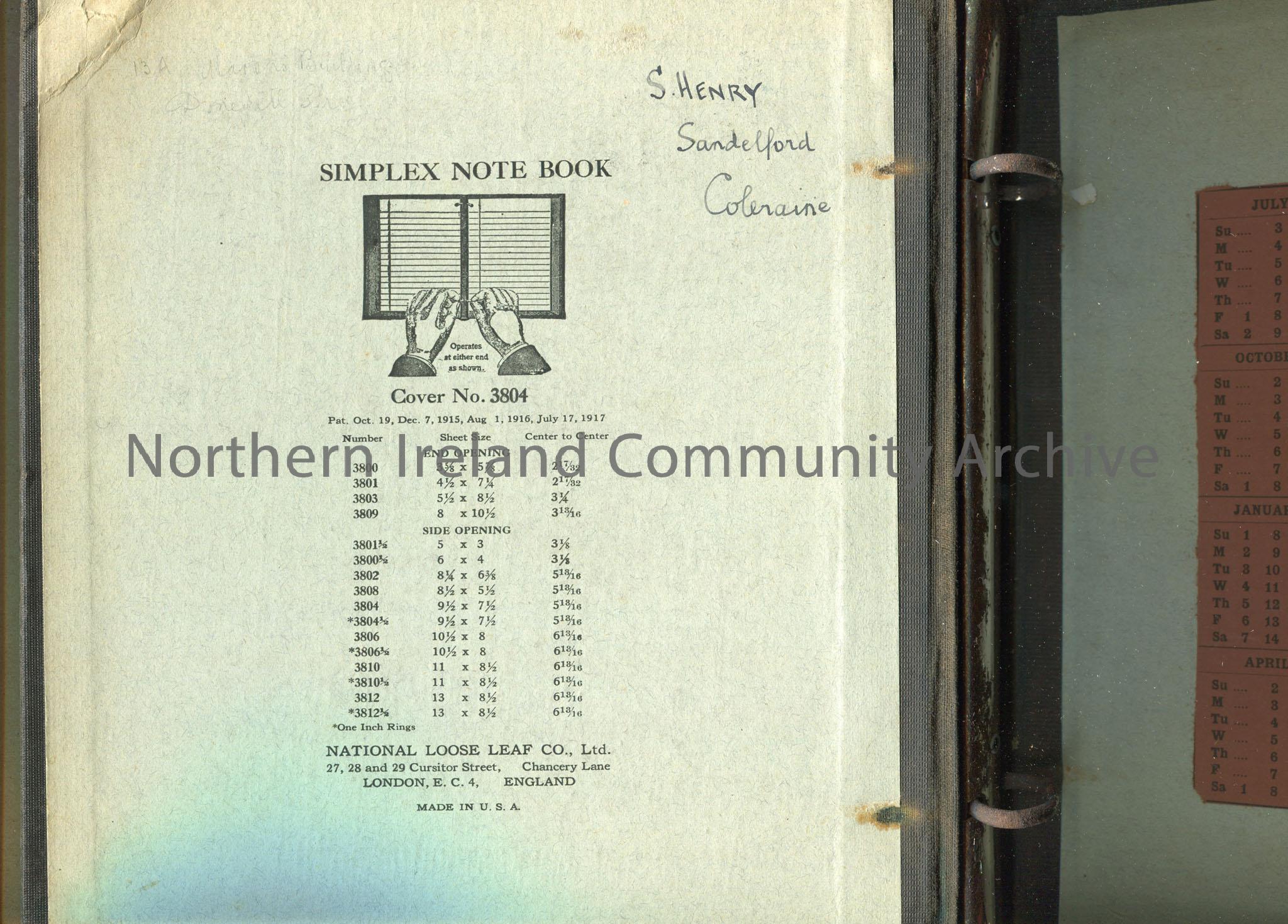 Black, ring binder folder, 'Simplex Note Book', labelled 'Articles' on spine of folder. Inside is written 'S.Henry, Sandelford, Coleraine' and a calendar from July 1932 to June 1933 which is stuck to the inside cover on the right. An address is faintly written in pencil on inside top left - 13A Marsh's Building, Donegall Street.