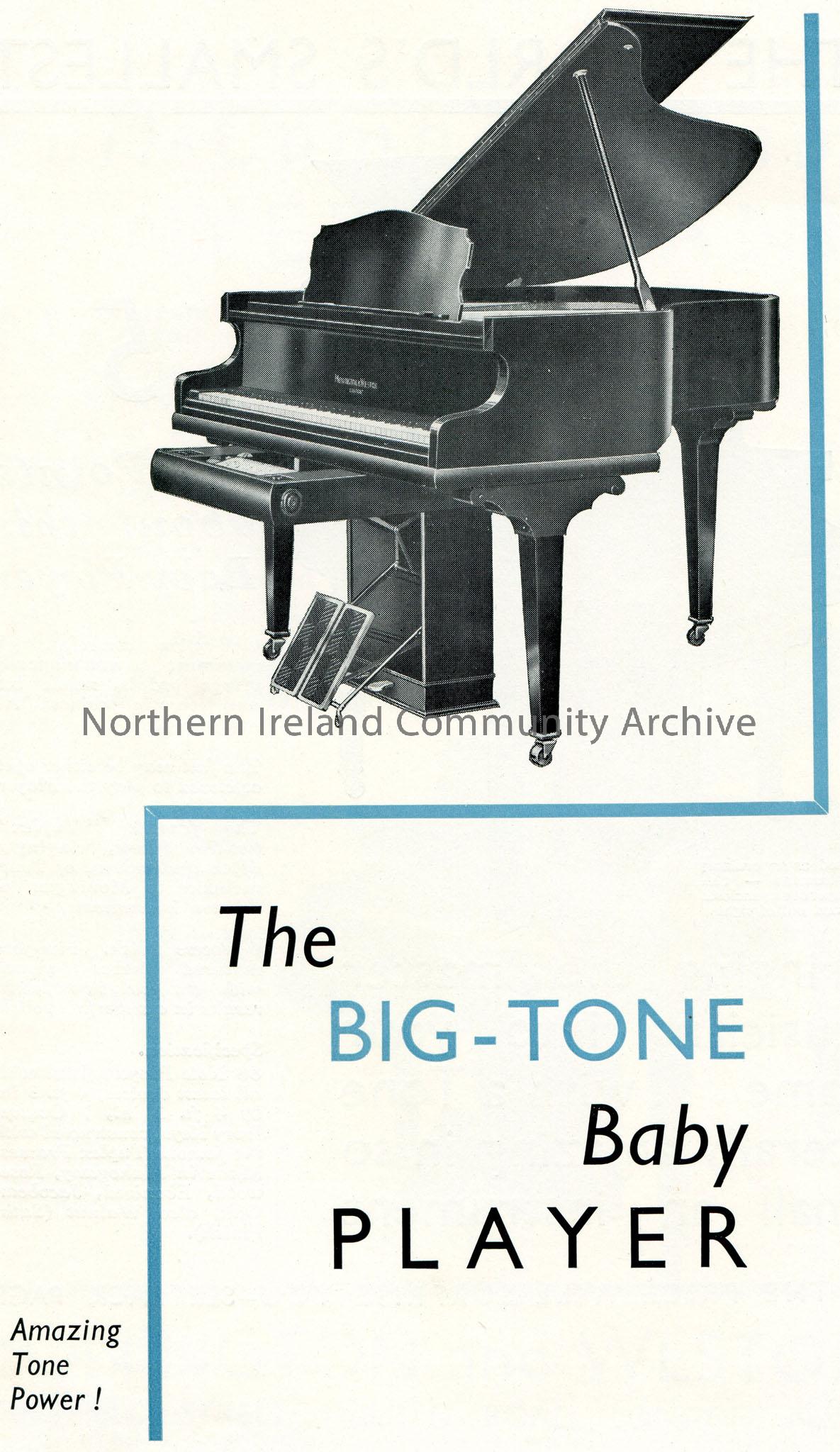 Black, white and blue Monington & Weston, London printed (on four sides) leaflet for 'The Big-Tone Baby Player' piano. Priced at 118 guineas.