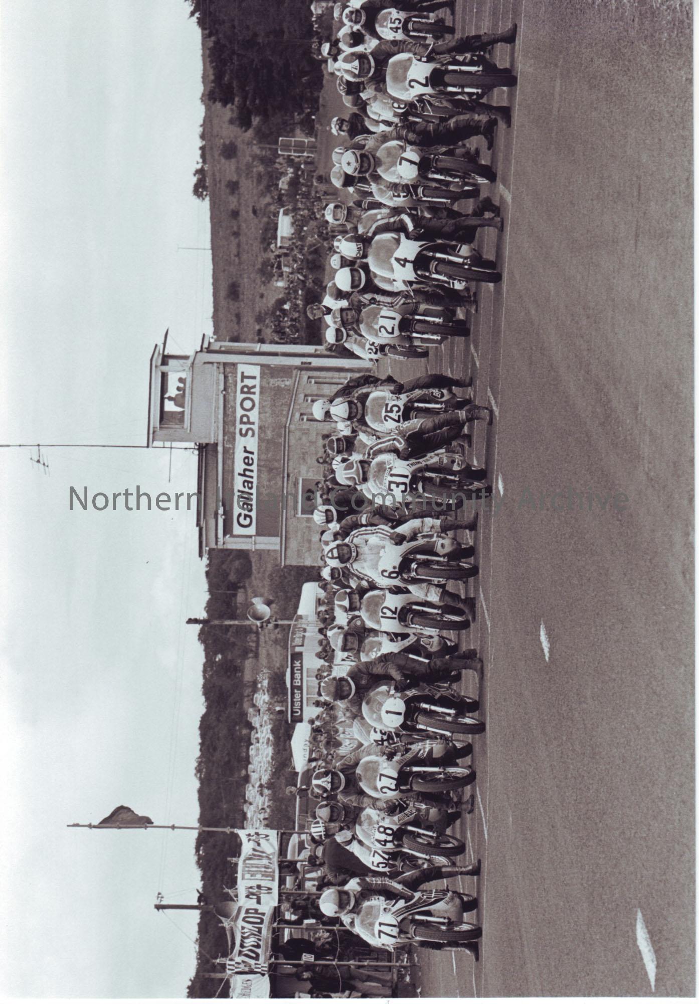 Black & white photograph of racers on the starting grid