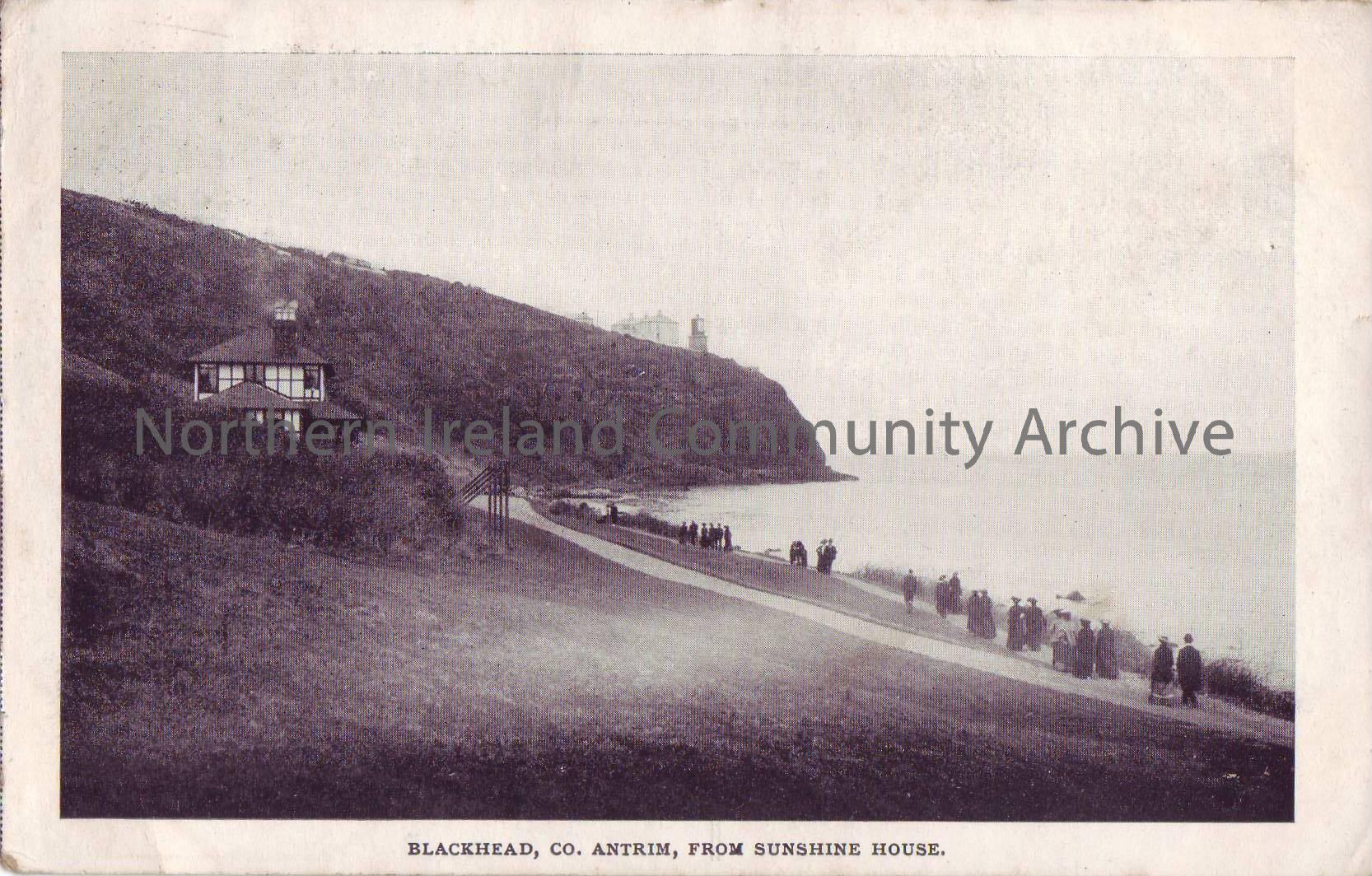 postcard titled, Blackhead, Co.Antrim from Sunshine house. People wearing Victorian dress walking along a coastal path with house on the left side with wooden beam features