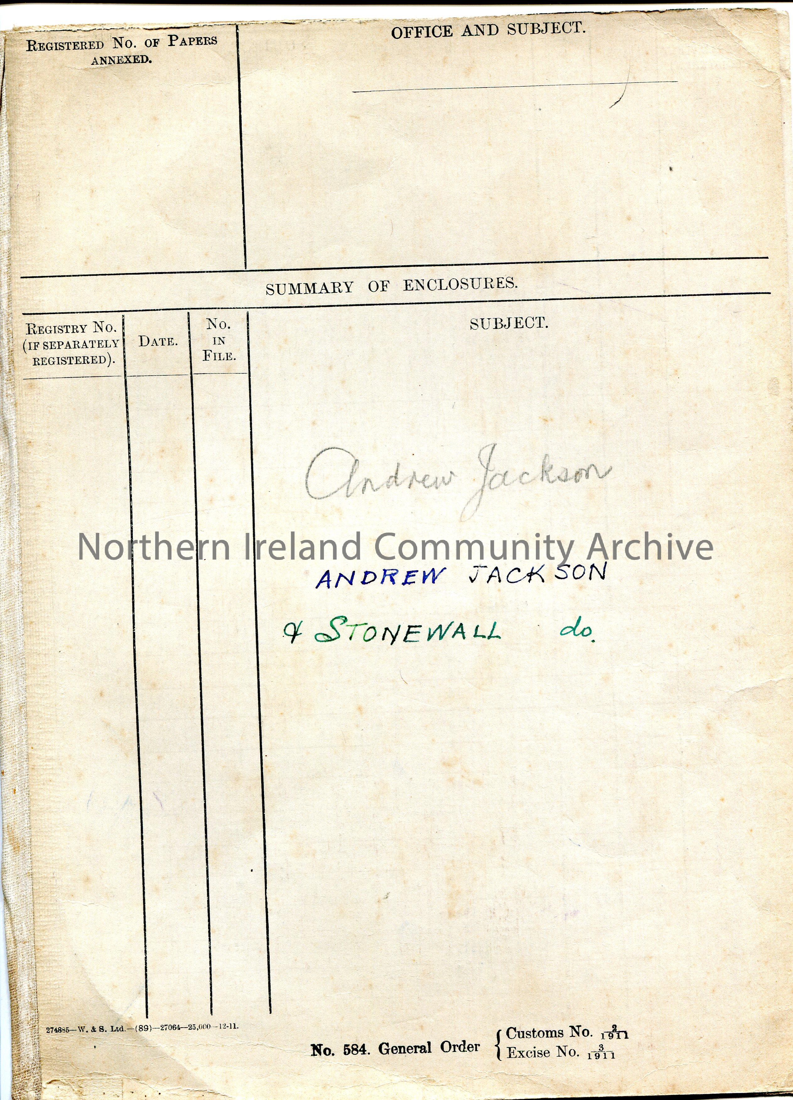 Blank Customs and Excise folder labelled ‘Andrew Jackson. Andrew Jackson & Stonewall do’. Folder is made up of two pieces of card held together at the…
