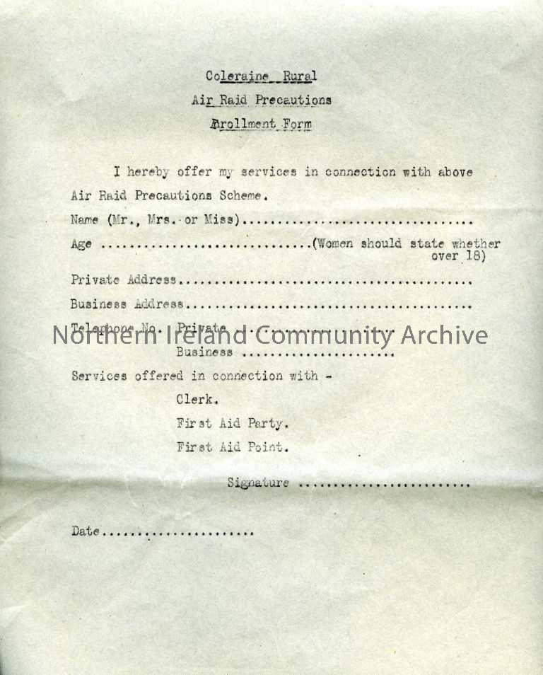 Blank form - 'Coleraine Rural Air Raid Precautions Enrollment Form'. For people to offer their services to the Air Raid Precautions Scheme as a Clerk, in the First Aid Party or First Aid Point.