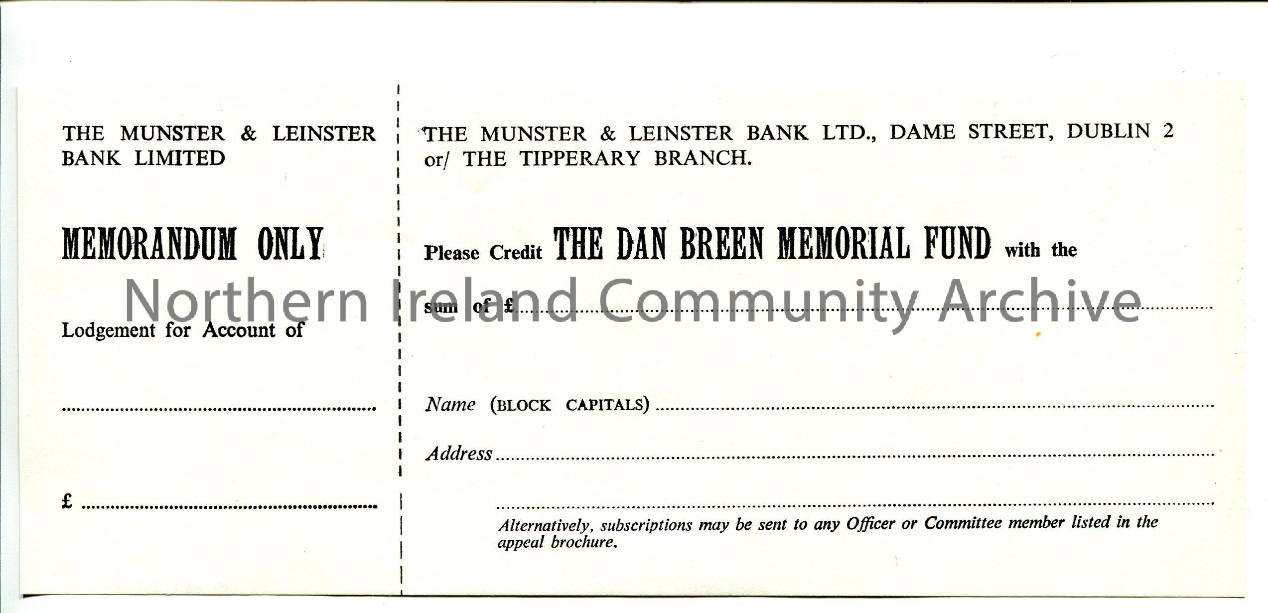 Blank subscription slip for credit into ‘The Dan Breen Memorial Fund’ through The Munster & Leinster Bank Ltd., Dame Street, Dublin 2 or Tipperary Bra…