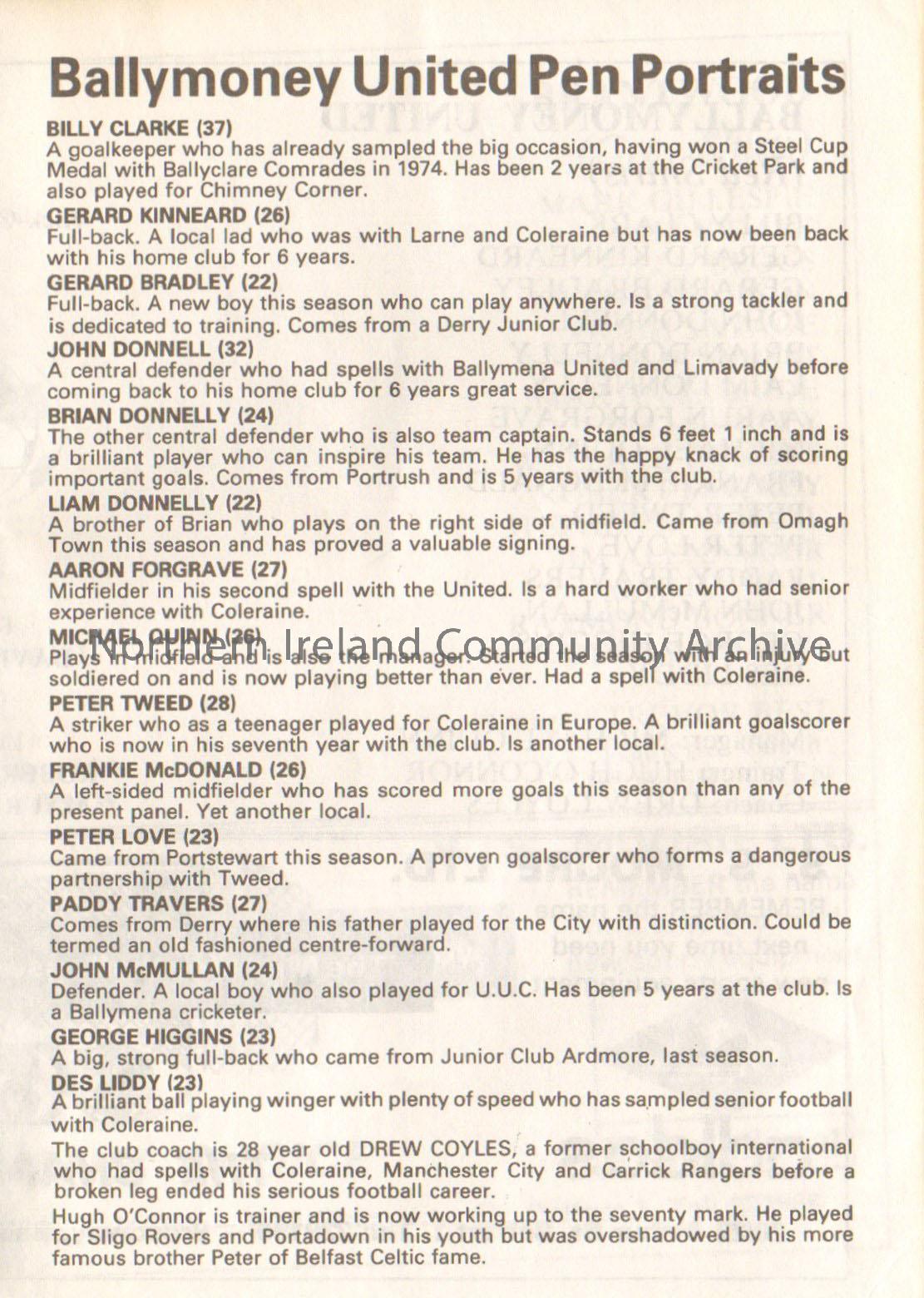 Blue and white football programme - Steel and Sons Cup Final Ballymoney United v Brantwood