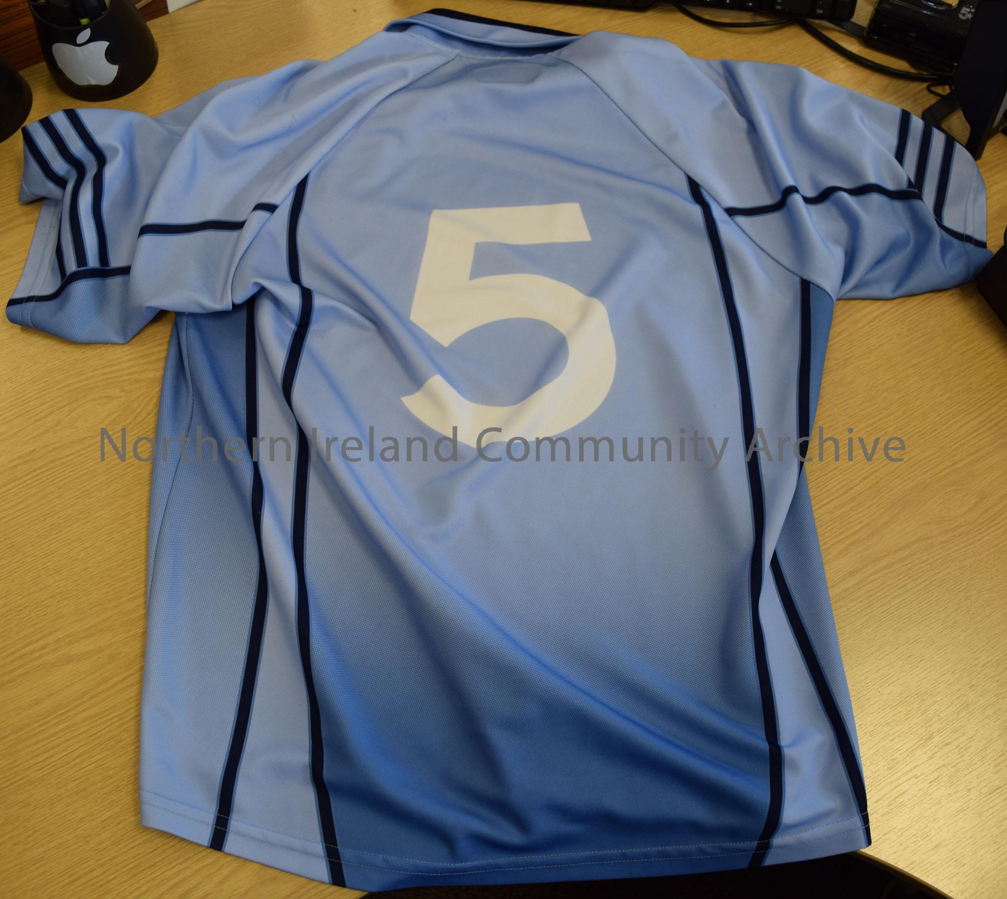 Blue Ballymoney Sentantas jersey. Badge with shamrock on front. Number 5 on the back – 2014.165 (1)