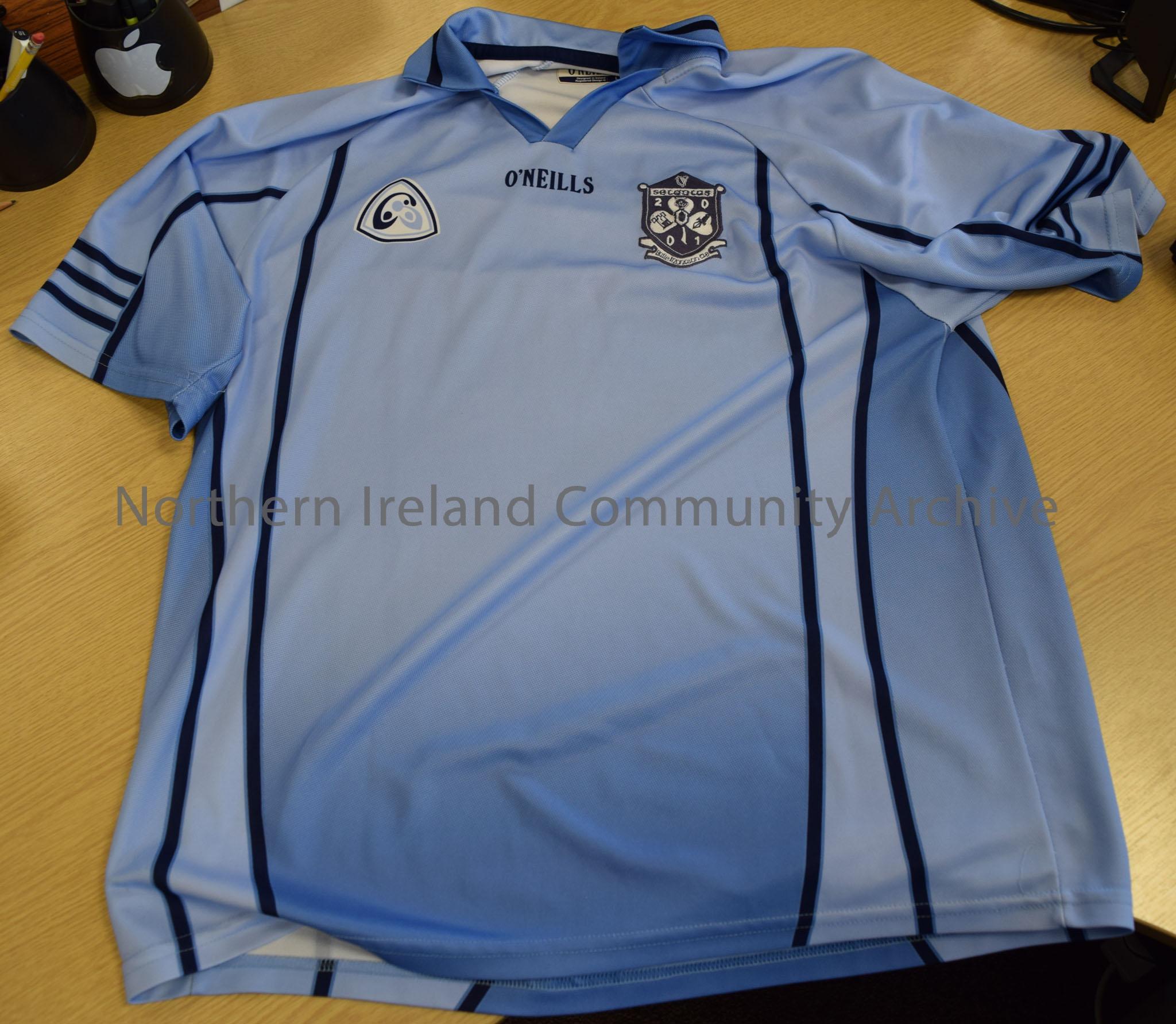 Blue Ballymoney Sentantas jersey. Badge with shamrock on front. Number 5 on the back