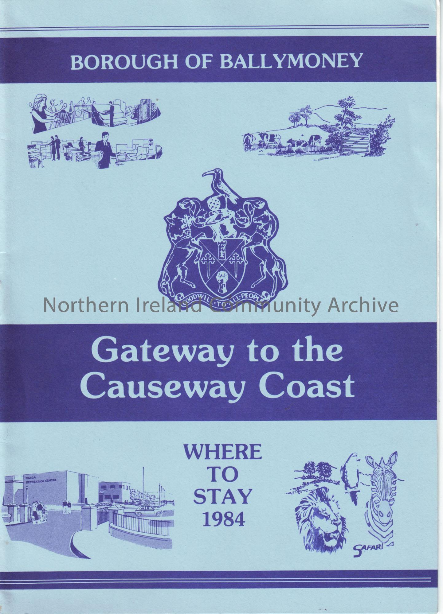 Blue brochure of the Borough of Ballymoney 'Gateway to the Causeway Coast' Where to stay 1984