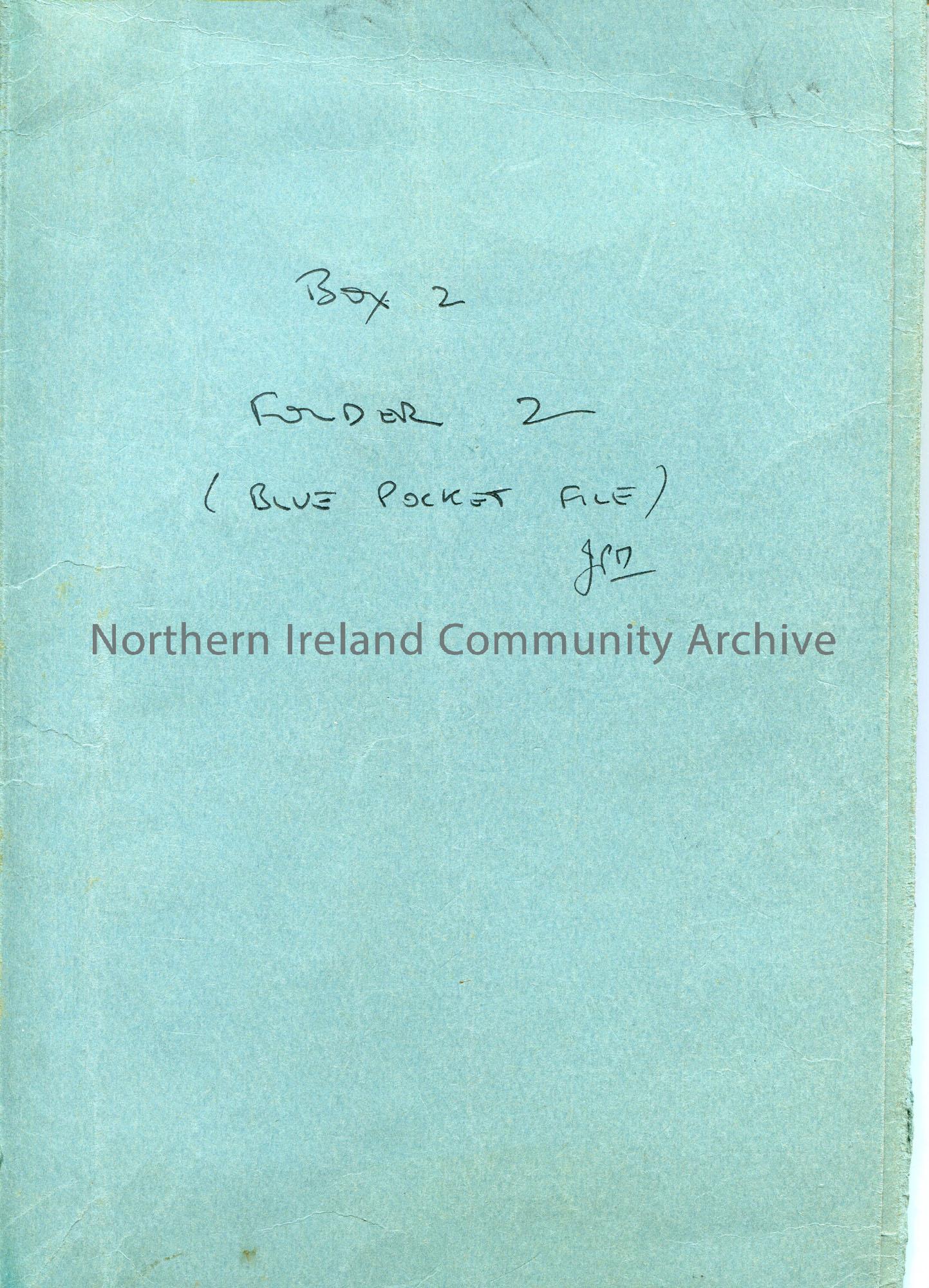 Blue folder. Typed white label on back 'Water Colours of White Rocks. Poem on "The Old Master". Handwritten on front in black ink 'Box 2. Folder 2. (Blue Pocket File) J M'.
