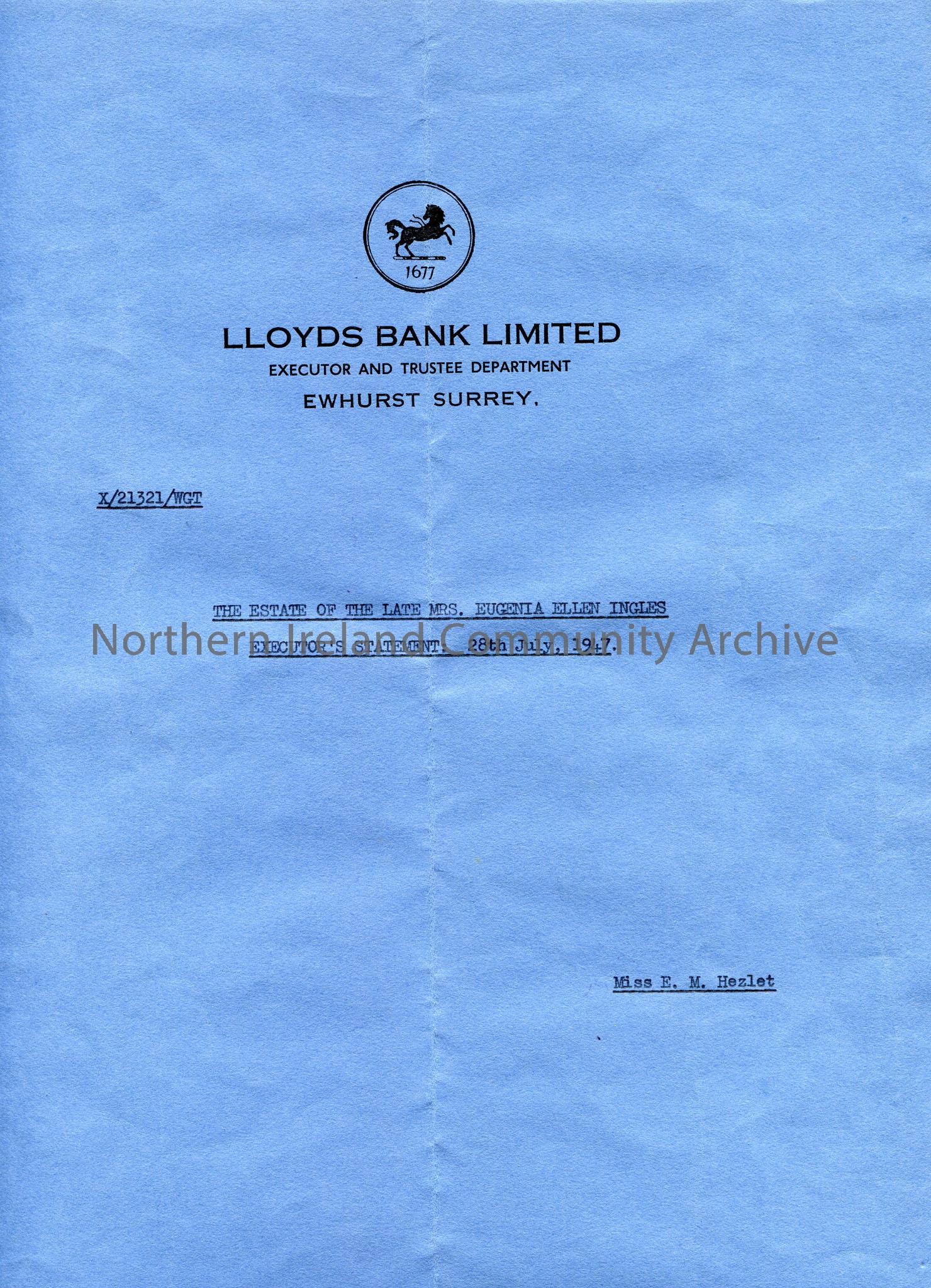 Blue folder with 6 pages attached inside, typed. Estate records from Lloyds Bank Limited, Executor and Trustee Department, Ewhurst Surrey, of the late Mrs Eugenia Ellen Ingles. Executor's Statement: 28th July, 1947, Miss E. M. Hezlet. Contents of estate and their value listed along with beneficiaries. Statement on last page from Emily Mary Hezlet confirming the amount received from the estate at £2630.6.9.