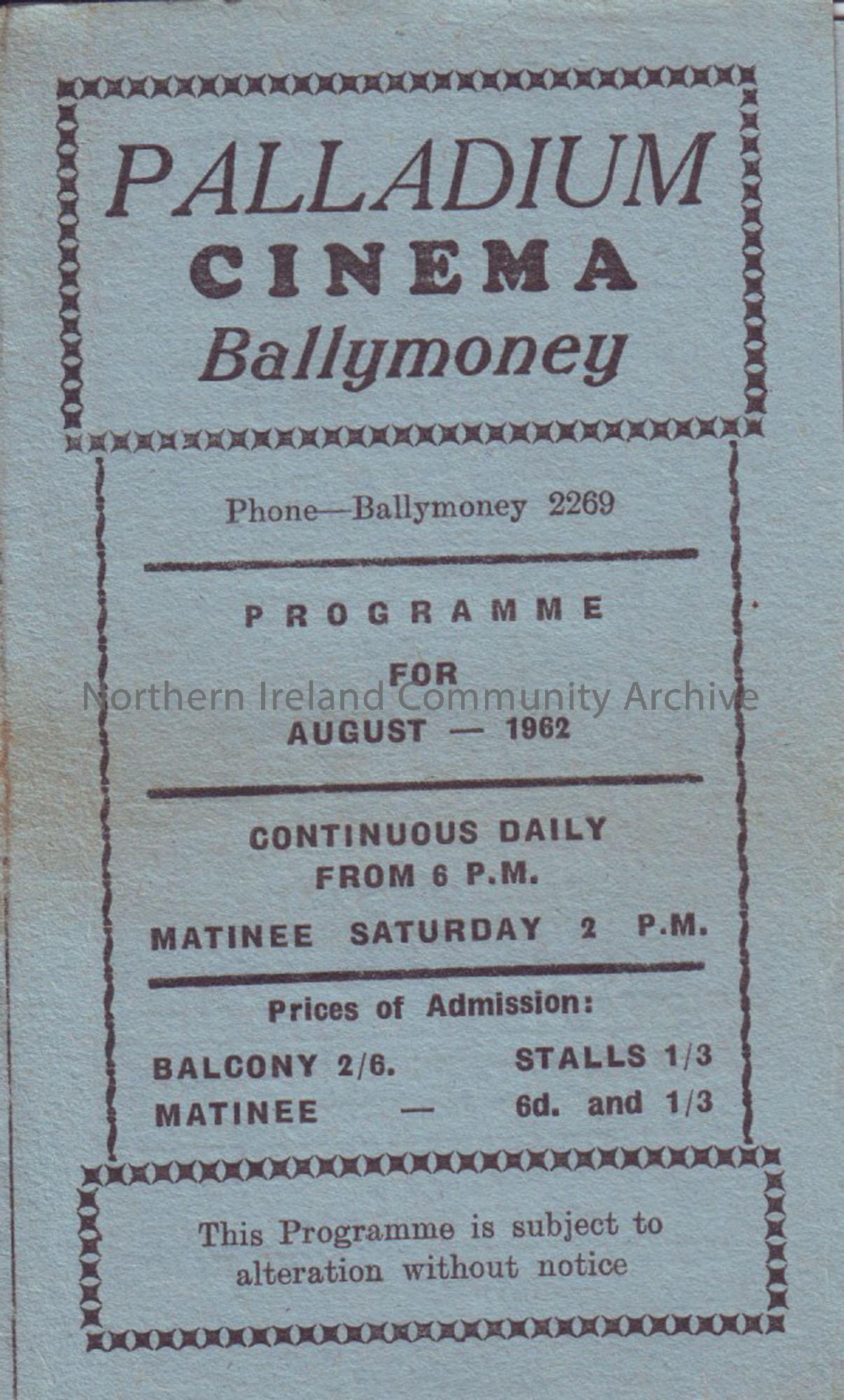blue monthly programme for Ballymoney Palladium cinema- August 1962