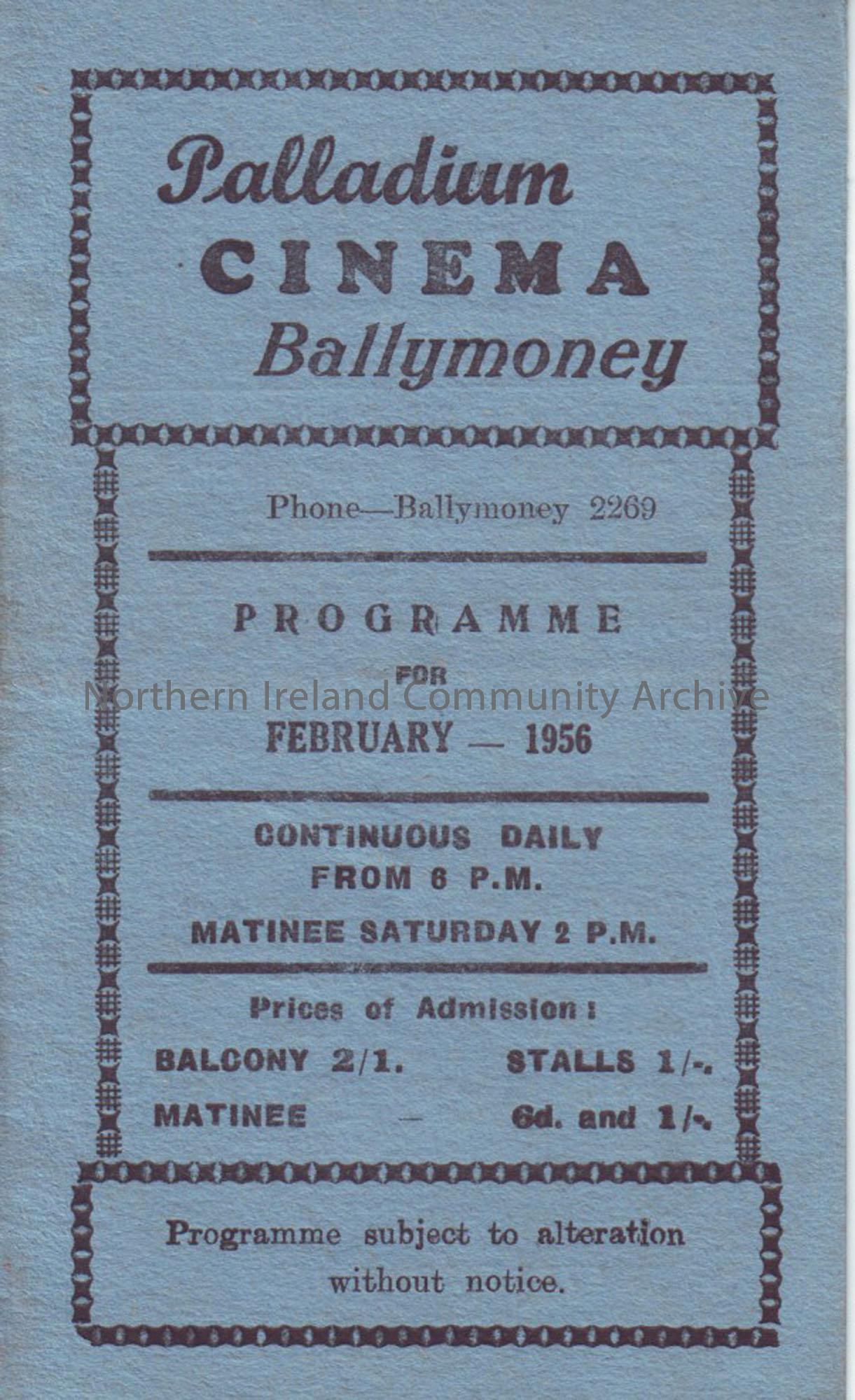 blue monthly programme for Ballymoney Palladium cinema- February 1956