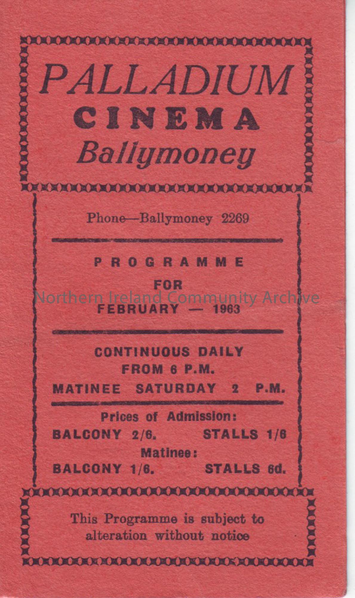 blue monthly programme for Ballymoney Palladium cinema- February 1963