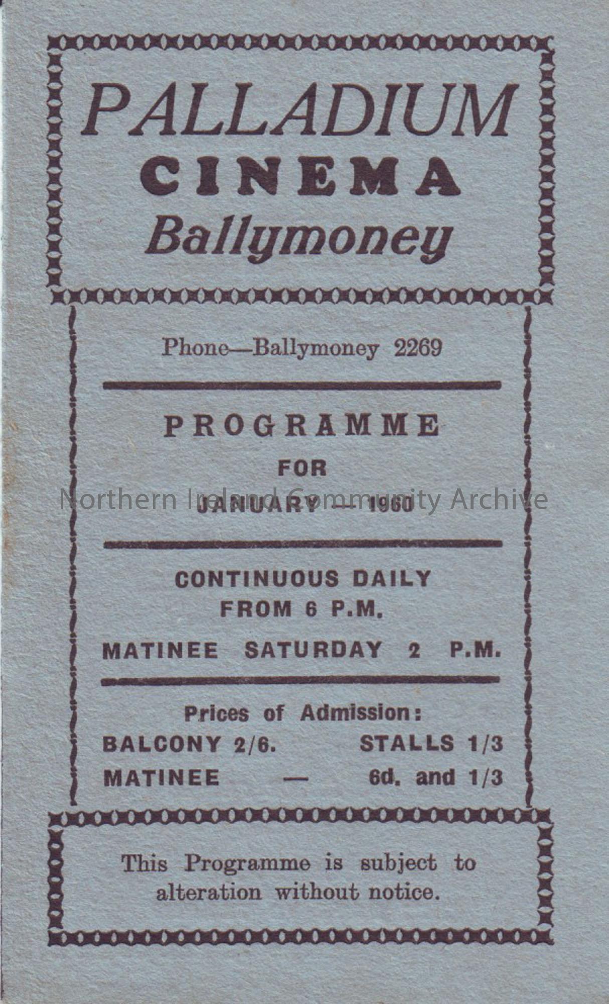 blue monthly programme for Ballymoney Palladium cinema- January 1960