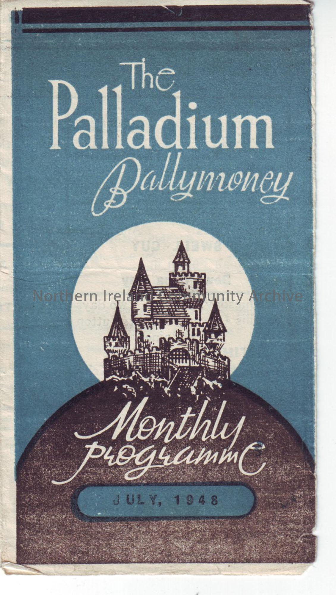 blue monthly programme for Ballymoney Palladium cinema- July 1948