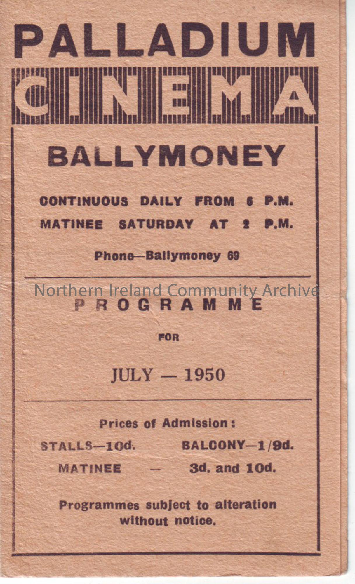 blue monthly programme for Ballymoney Palladium cinema- July 1950