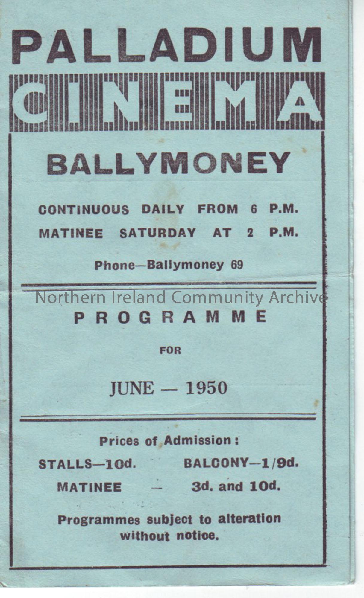 blue monthly programme for Ballymoney Palladium cinema- June 1950