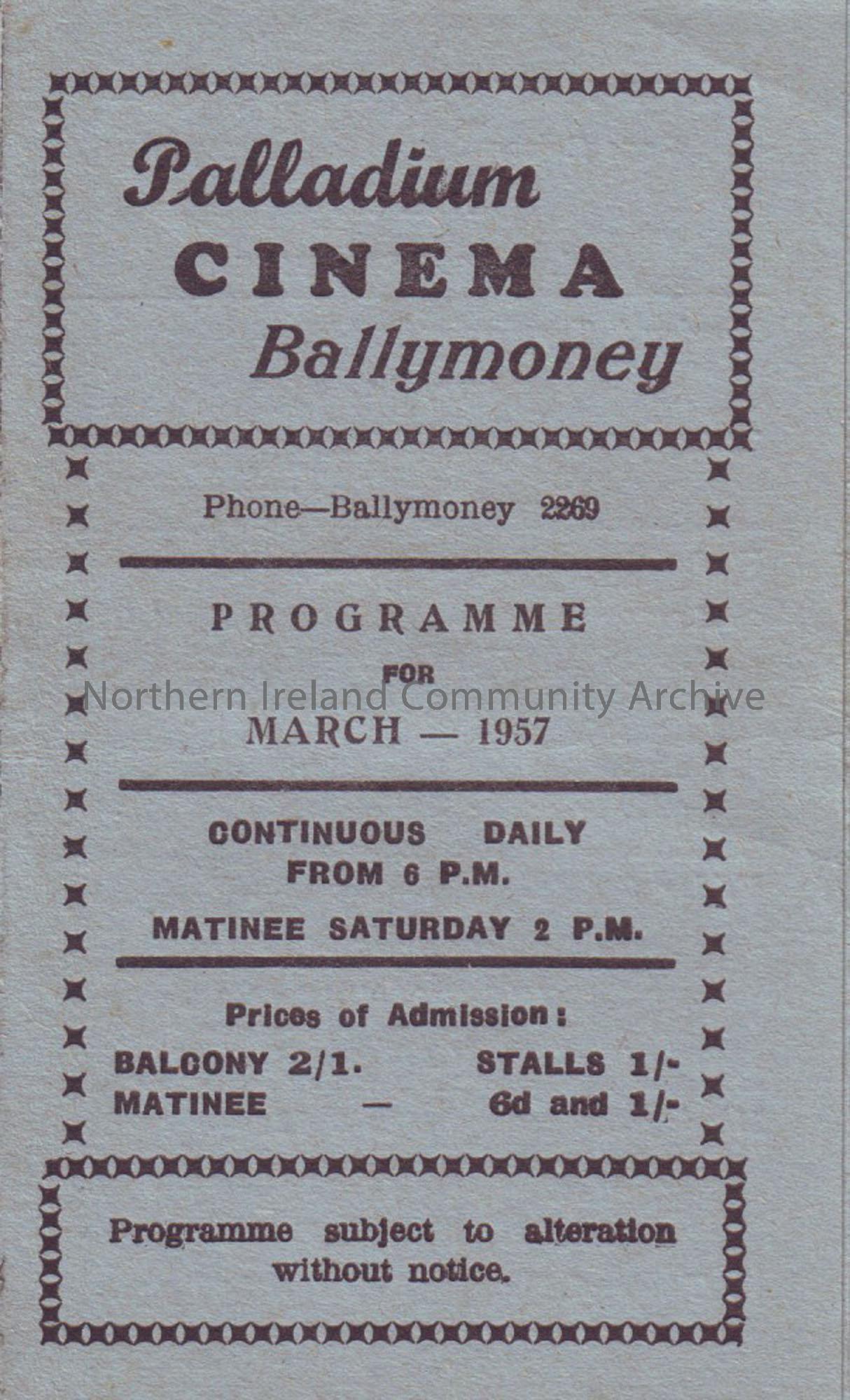 blue monthly programme for Ballymoney Palladium cinema- March 1957