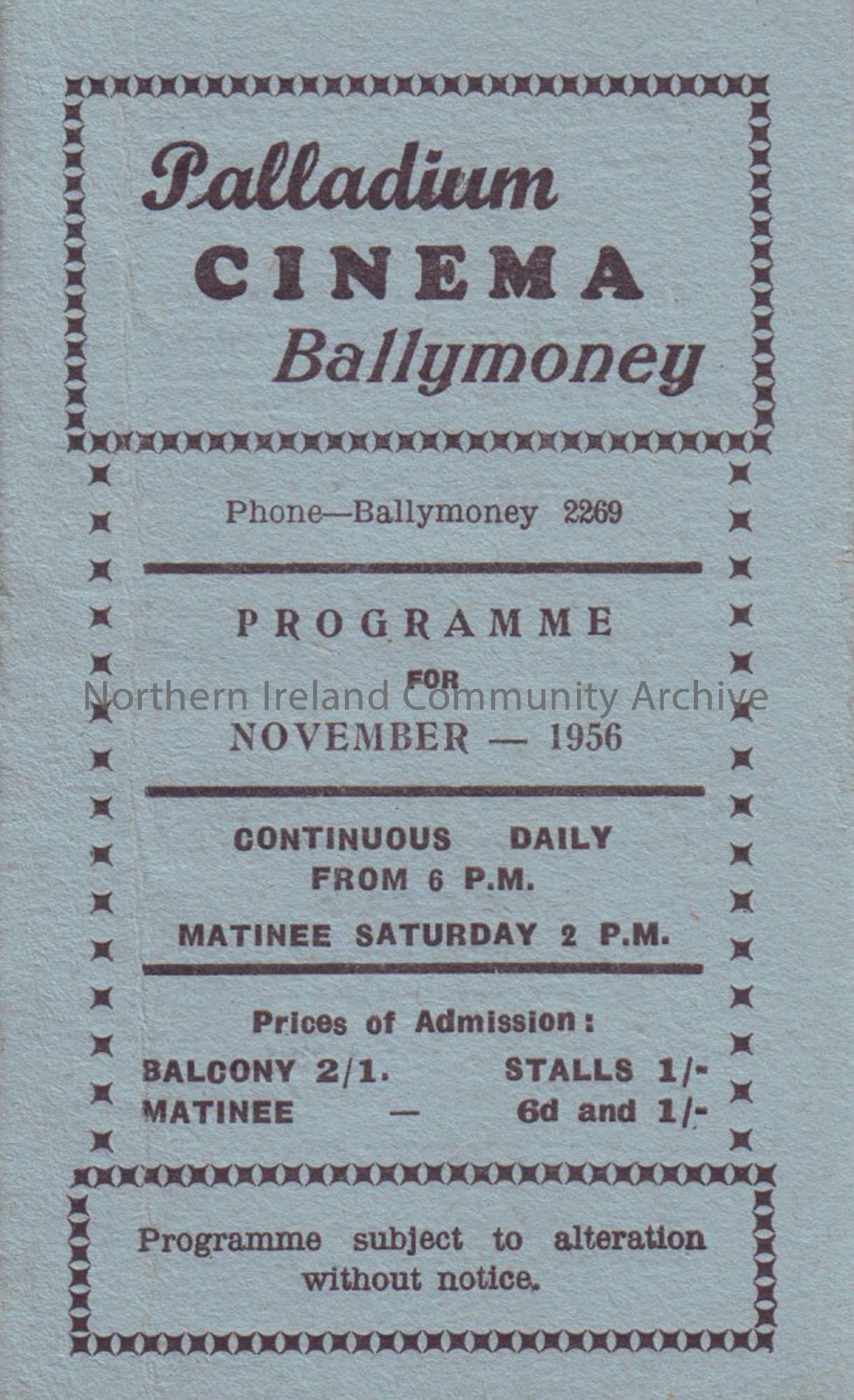 blue monthly programme for Ballymoney Palladium cinema- November 1956