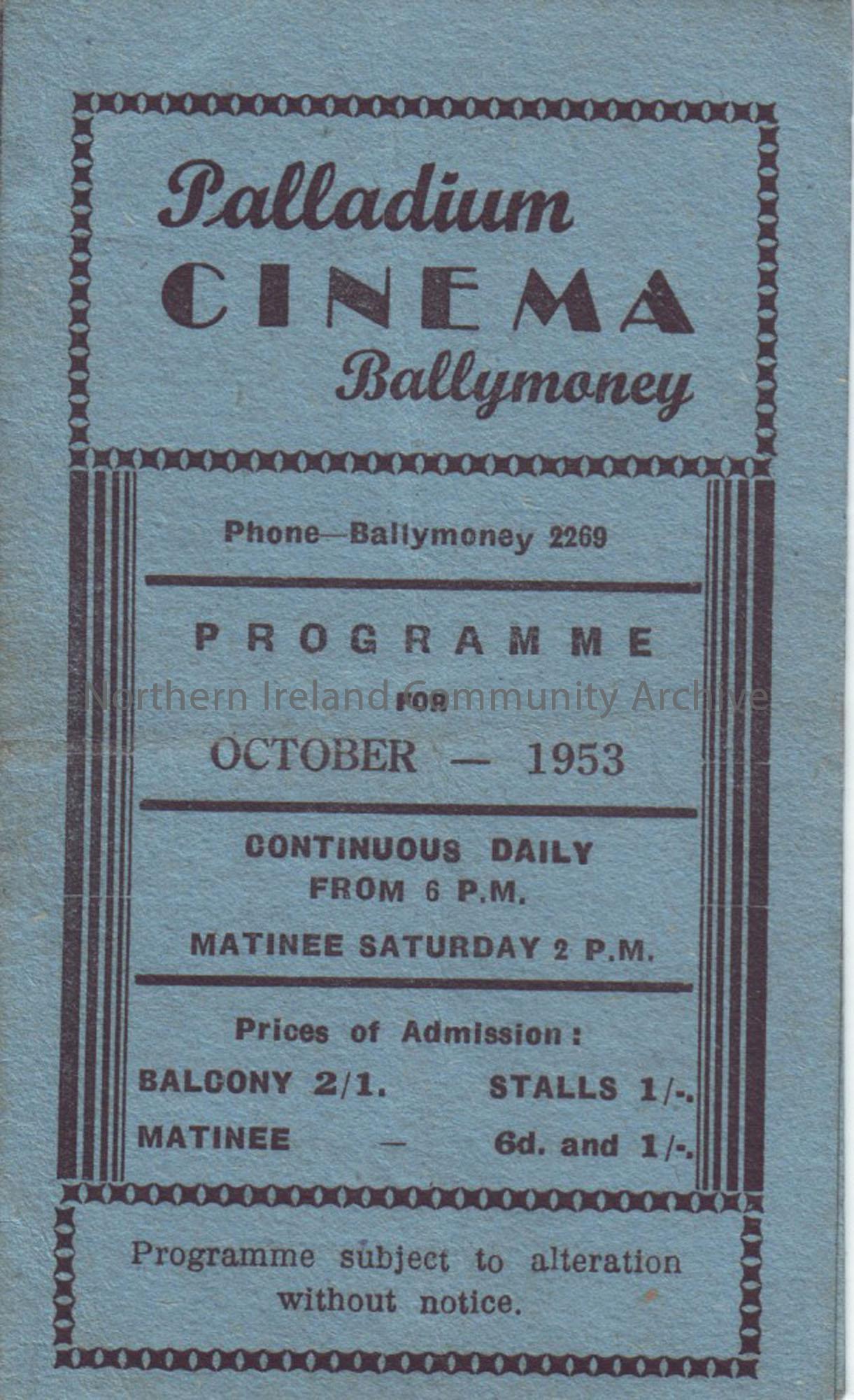 blue monthly programme for Ballymoney Palladium cinema- October 1953