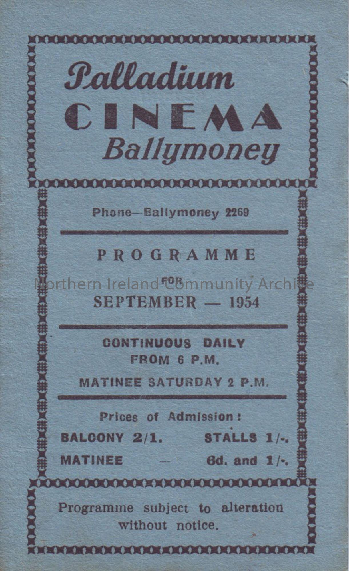 blue monthly programme for Ballymoney Palladium cinema- September 1954