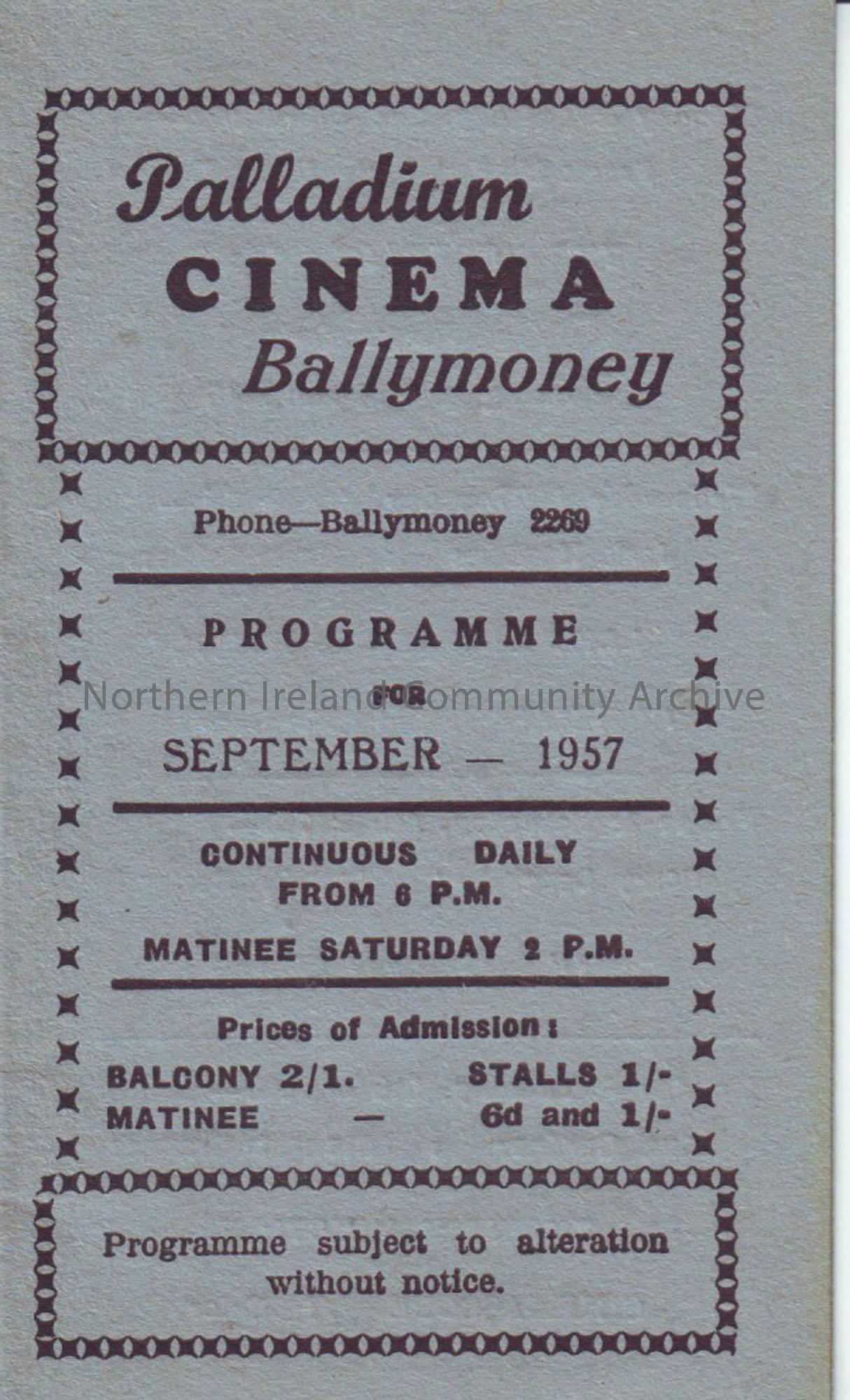 blue monthly programme for Ballymoney Palladium cinema- September 1957