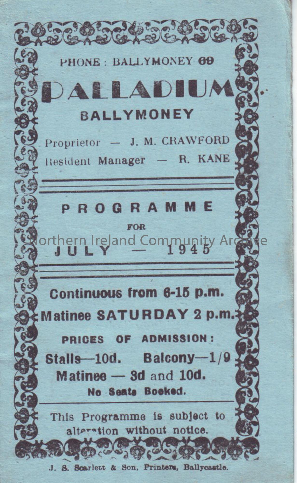 blue programme for Ballymoney Palladium cinema- July 1945
