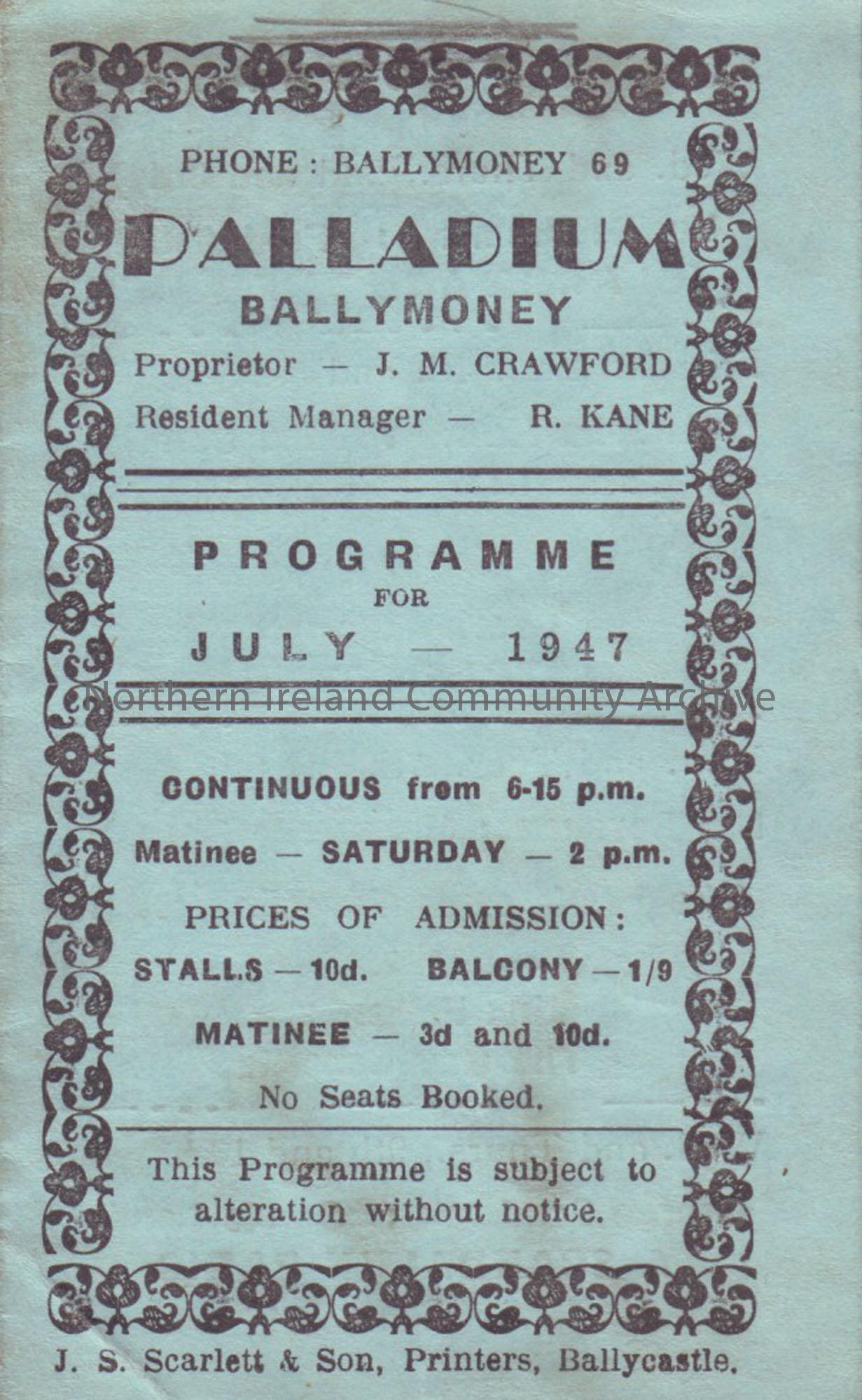 blue programme for Ballymoney Palladium cinema- July 1947