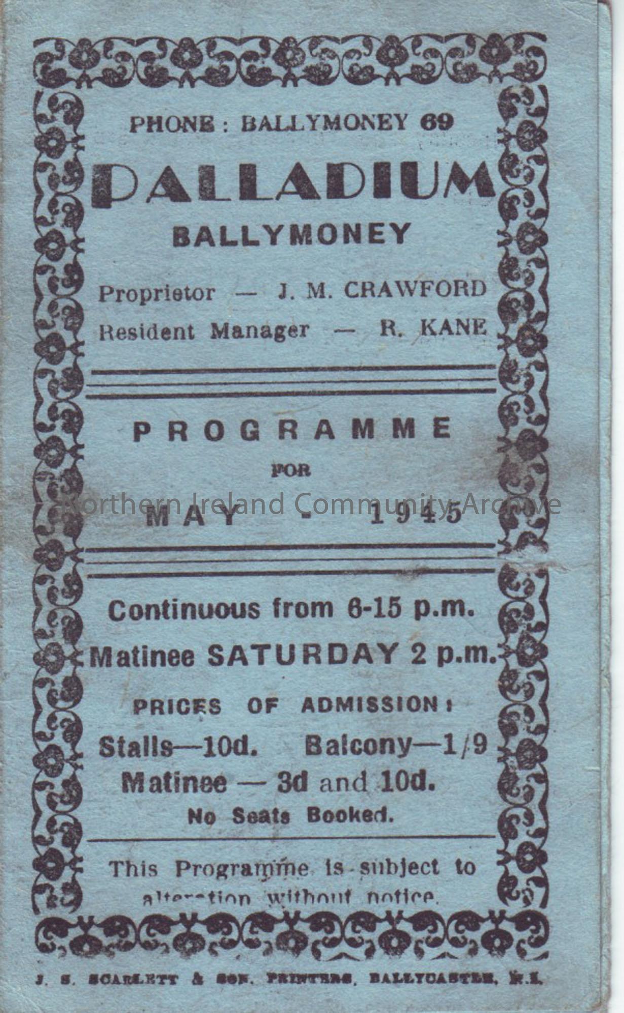 blue programme for Ballymoney Palladium cinema- May 1945