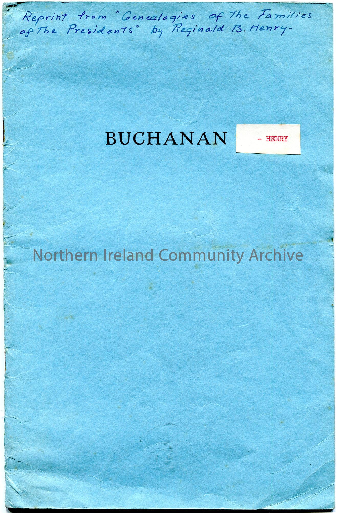 Blue stapled booklet with printed pages. Named 'Buchanan - Henry'. 'Reprint from "Genealogies of the Families of the Presidents" by Reginald B. Henry' handwritten on top of front cover. An 'X' marked against a point re re. Edward Young Buchanan.