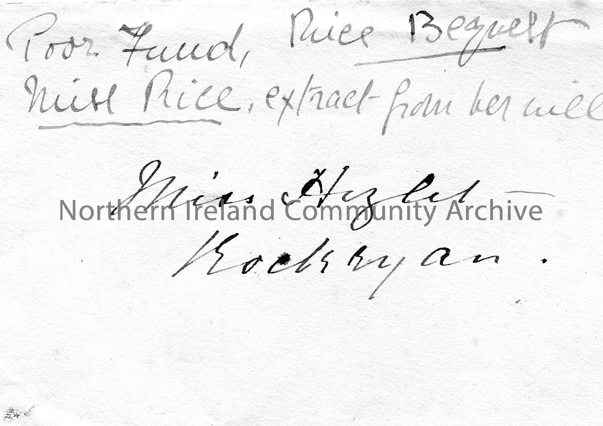 Blue/grey envelope with ‘Poor Fund, Rice Bequest, Miss Rice, extract from her will’ and Miss Hezlet, Rockryan handwritten on front.