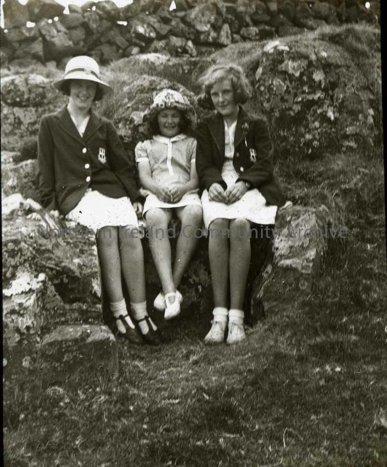 3 young girls - 2 in school blazers and 1 in school hat -sitting outdoors - Sconce chair. (JM - Olive Henry is the middle, with Betty and Margaret Simpson either side, wearing High School blazers)