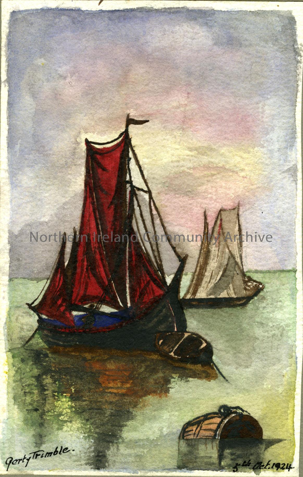 small Portrait watercolour painting depicting two sailing boats at sea, with wooden barrel. Signed by 'Gerty' Trimble at the bottom left corner.