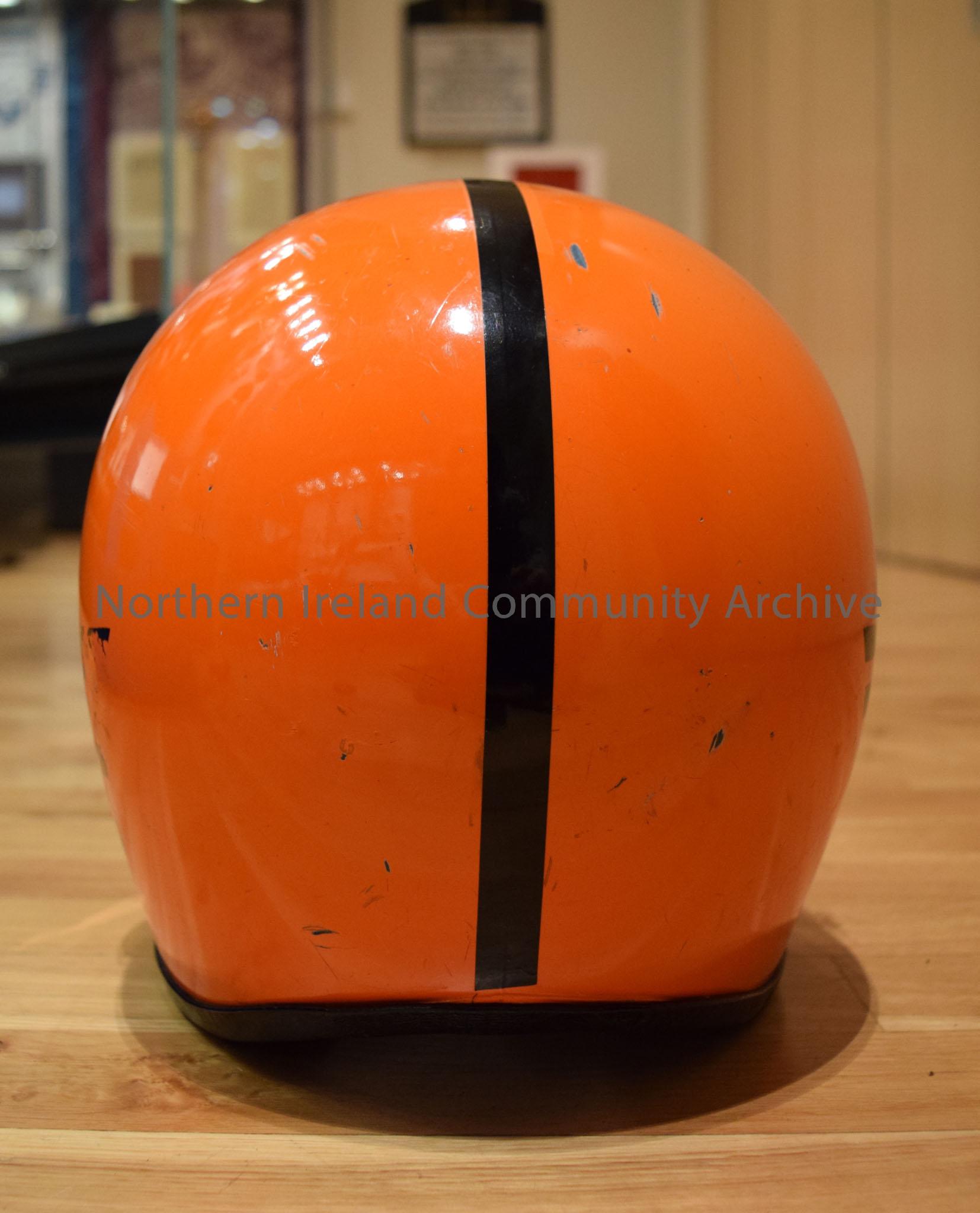 Boeri motorcycle helmet belonging to Joey Dunlop. Orange with a single black running over the top and three black stripes on either side. – 2016.107 (4)