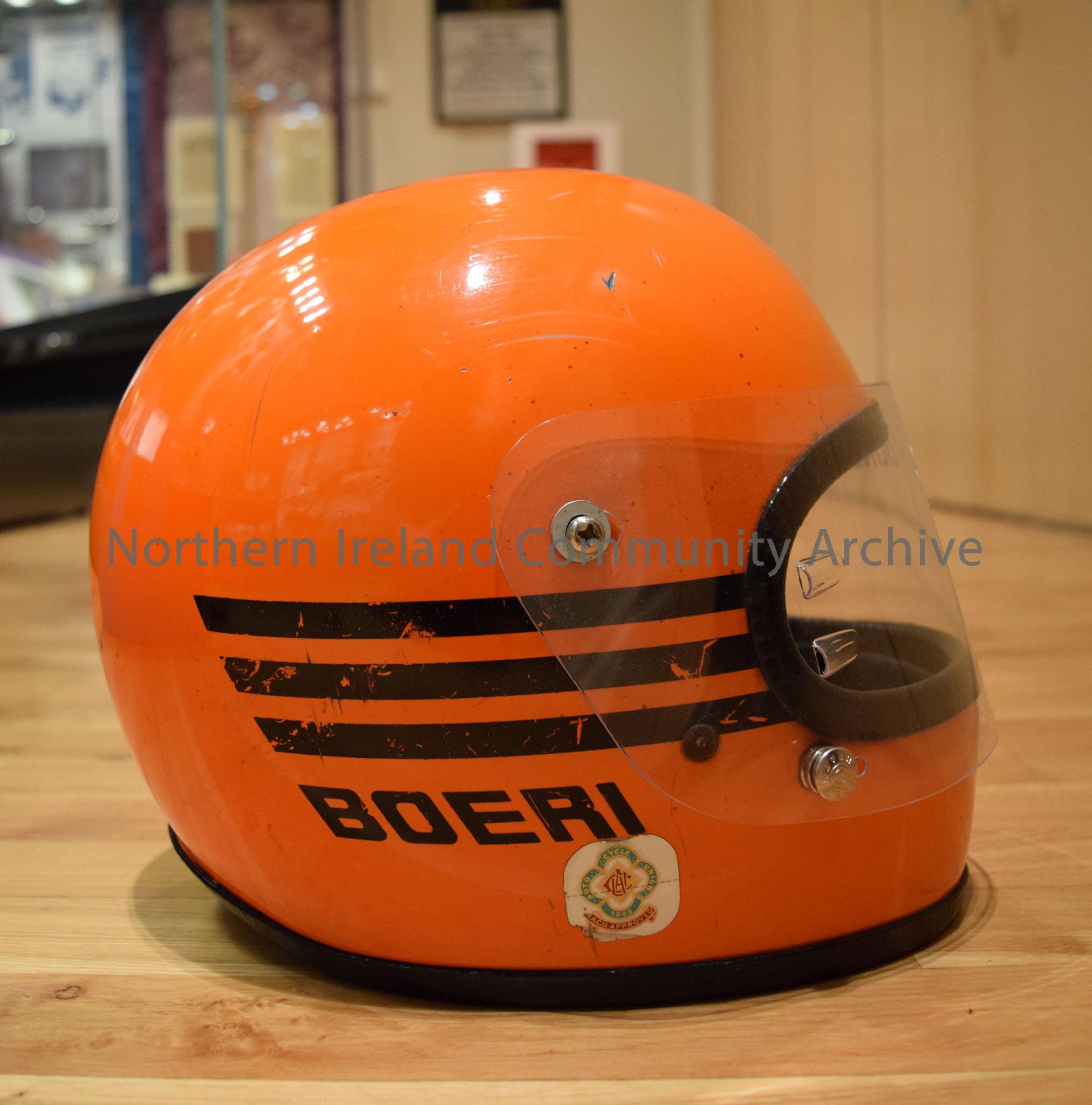 Boeri motorcycle helmet belonging to Joey Dunlop. Orange with a single black running over the top and three black stripes on either side. – 2016.107 (5)