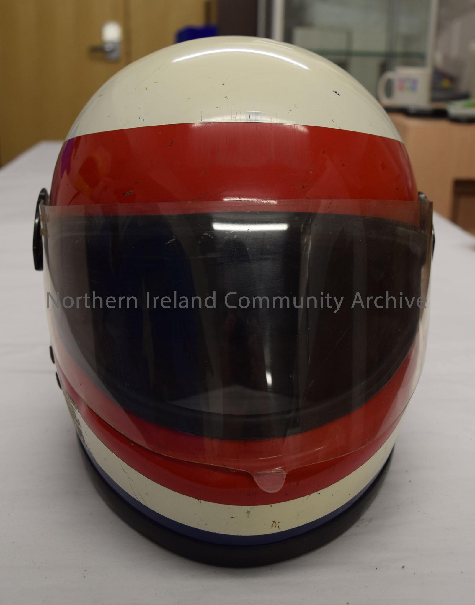 Boeri motorcycle helmet. White with red front and blue around the bottom and back – 2016.21 (2)