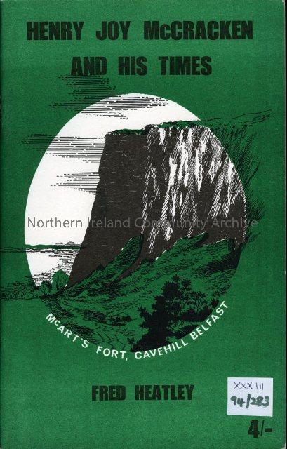 Henry John McCracken & his Times. Front cover (green) depicts the Cavehill, Belfast, showing McArts Fort.Price 4/- Courtesy of Ballycastle Museum.