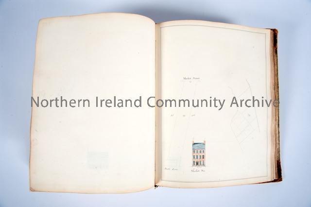 Folio of architectural drawings and watercolours from 1816-1818 of Coleraine town centre. Illustrations contain 17th century buildings that continue to exist and are the best representation of the town during Plantation. Donated to Coleraine Museum by D. MacLaughlin.