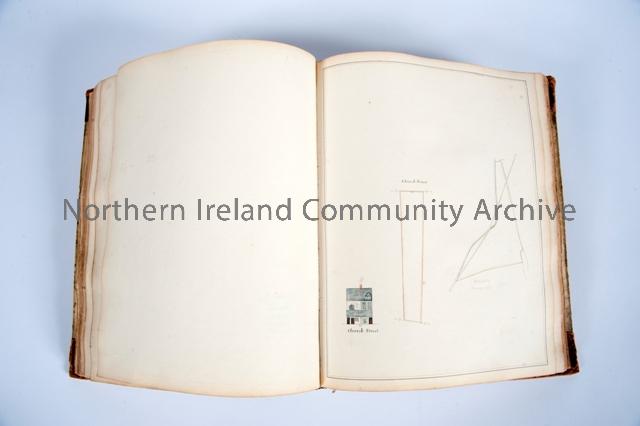 Folio of architectural drawings and watercolours from 1816-1818 of Coleraine town centre. Illustrations contain 17th century buildings that continue to exist and are the best representation of the town during Plantation. Donated to Coleraine Museum by D. MacLaughlin.
