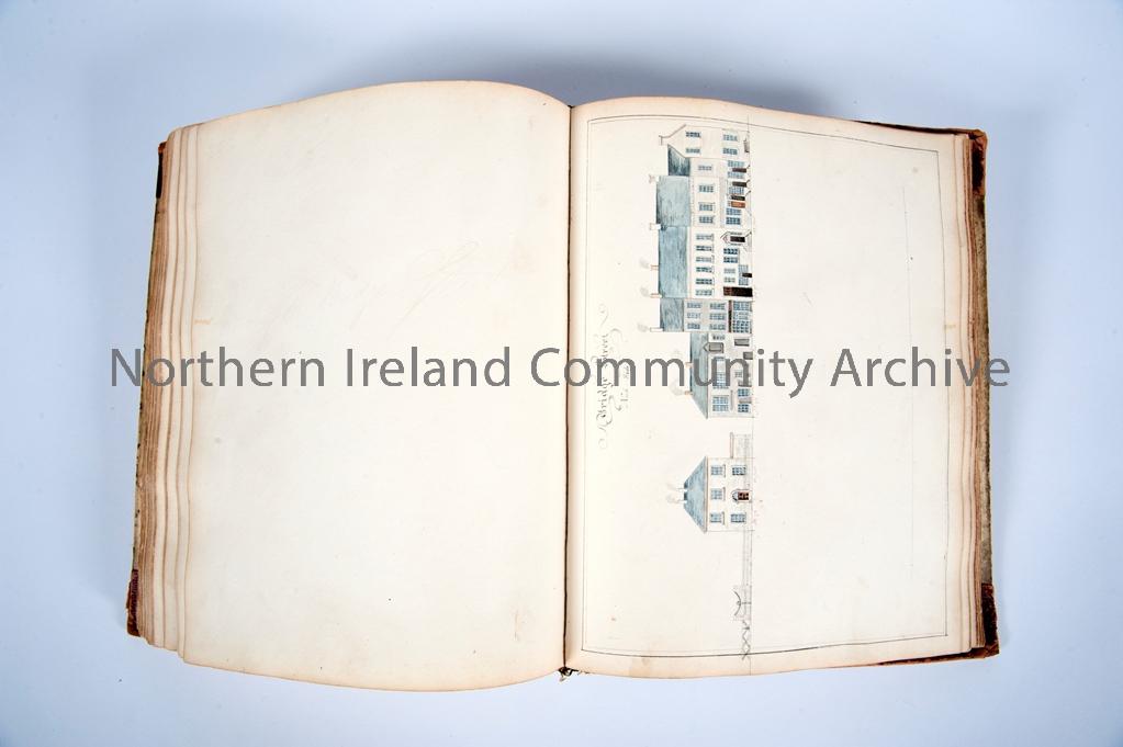 Folio of architectural drawings and watercolours from 1816-1818 of Coleraine town centre. Illustrations contain 17th century buildings that continue to exist and are the best representation of the town during Plantation. Building on left hand side is the Customs House for Coleraine Harbour. Donated to Coleraine Museum by D. MacLaughlin. Please note contents used by James Curl in