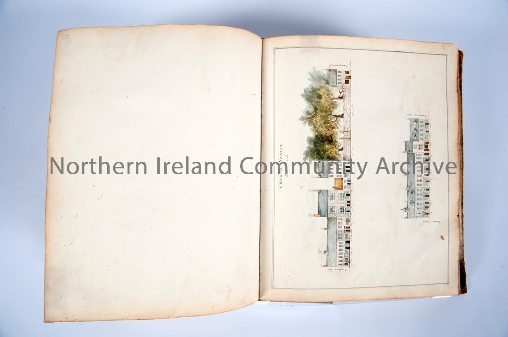 Folio of architectural drawings and watercolours from 1816-1818 of Coleraine town centre. Illustrations contain 17th century buildings that continue to exist and are the best representation of the town during Plantation. Donated to Coleraine Museum by D. MacLaughlin. Please note contents used by James Curl in