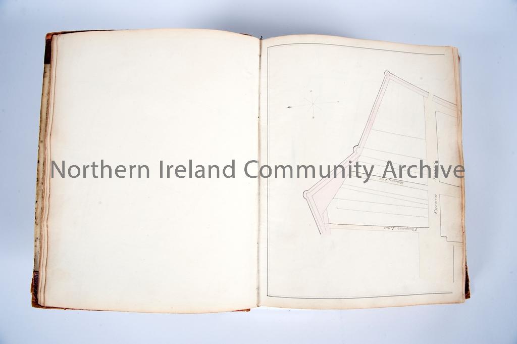 Folio of architectural drawings and watercolours from 1816-1818 of Coleraine town centre. Illustrations contain 17th century buildings that continue to exist and are the best representation of the town during Plantation. Also showing Thompson's Lane and Rosemary Lane. Donated to Coleraine Museum by D. MacLaughlin. Please note contents used by James Curl in
