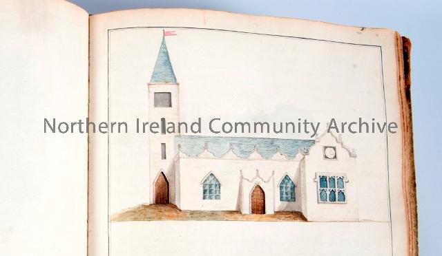 Folio of architectural drawings and watercolours from 1816-1818 of Coleraine town centre. Illustrations contain 17th century buildings that continue to exist and are the best representation of the town during Plantation. Donated to Coleraine Museum by D. MacLaughlin.
