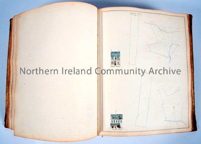 Folio of architectural drawings and watercolours from 1816-1818 of Coleraine town centre. Illustrations contain 17th century buildings that continue to exist and are the best representation of the town during Plantation. Donated to Coleraine Museum by D. MacLaughlin.