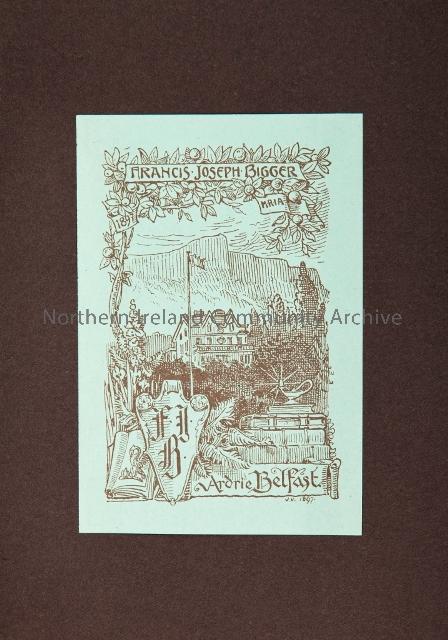 One of the book plates designed by John Vinycomb, 1906. John Vinycomb was born in Newcastle-on-Tyne. He studied art at the School of Design there, and in 1855 entered the art department of Marcus Ward & Co. as an engraver. He remained as head of the department until the break up of the firm in 1899, when he became an artist, designer and illuminator. He remained in Holywood, County Down until 1909. He was a member of the Royal Irish Academy; Vice-President of the Royal Society of Antiquaries of Ireland; Vice-President of the Ex-libra Society of London and founder and past President of the Belfast Art Society and the Ulster Arts Club. He also served as President of Belfast Naturalists' Field Club. He was a recognised authority on heraldry and illuminating, and he published books, notably on the illustration of bookplates. He died in London. The City Hall has an example of his scroll, and the Belfast Harbour Office and the Victoria and Albert Museum also have examples of his work.