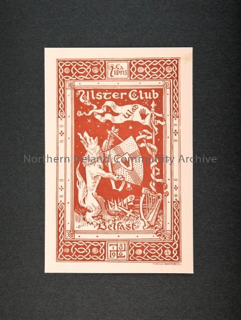One of the book plates designed by John Vinycomb, 1906. John Vinycomb was born in Newcastle-on-Tyne. He studied art at the School of Design there, and in 1855 entered the art department of Marcus Ward & Co. as an engraver. He remained as head of the department until the break up of the firm in 1899, when he became an artist, designer and illuminator. He remained in Holywood, County Down until 1909. He was a member of the Royal Irish Academy; Vice-President of the Royal Society of Antiquaries of Ireland; Vice-President of the Ex-libra Society of London and founder and past President of the Belfast Art Society and the Ulster Arts Club. He also served as President of Belfast Naturalists' Field Club. He was a recognised authority on heraldry and illuminating, and he published books, notably on the illustration of bookplates. He died in London. The City Hall has an example of his scroll, and the Belfast Harbour Office and the Victoria and Albert Museum also have examples of his work.