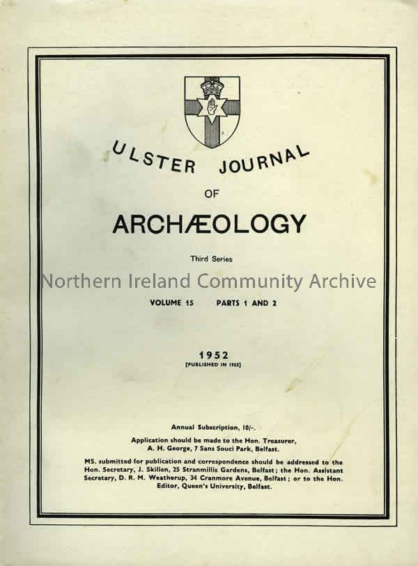 book titled, Ulster Journal of Archaeology. Third Series Volume 15, parts 1 and 2. 1952