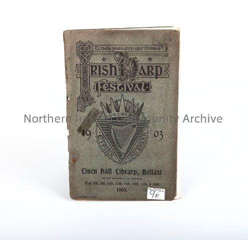 Programme for the 1903 Irish Harp Festival held in Belfast at the Linen Hall Library between May 8th-16th. The cover was designed by J. Vinycomb. Courtesy of Ballycastle Museum.