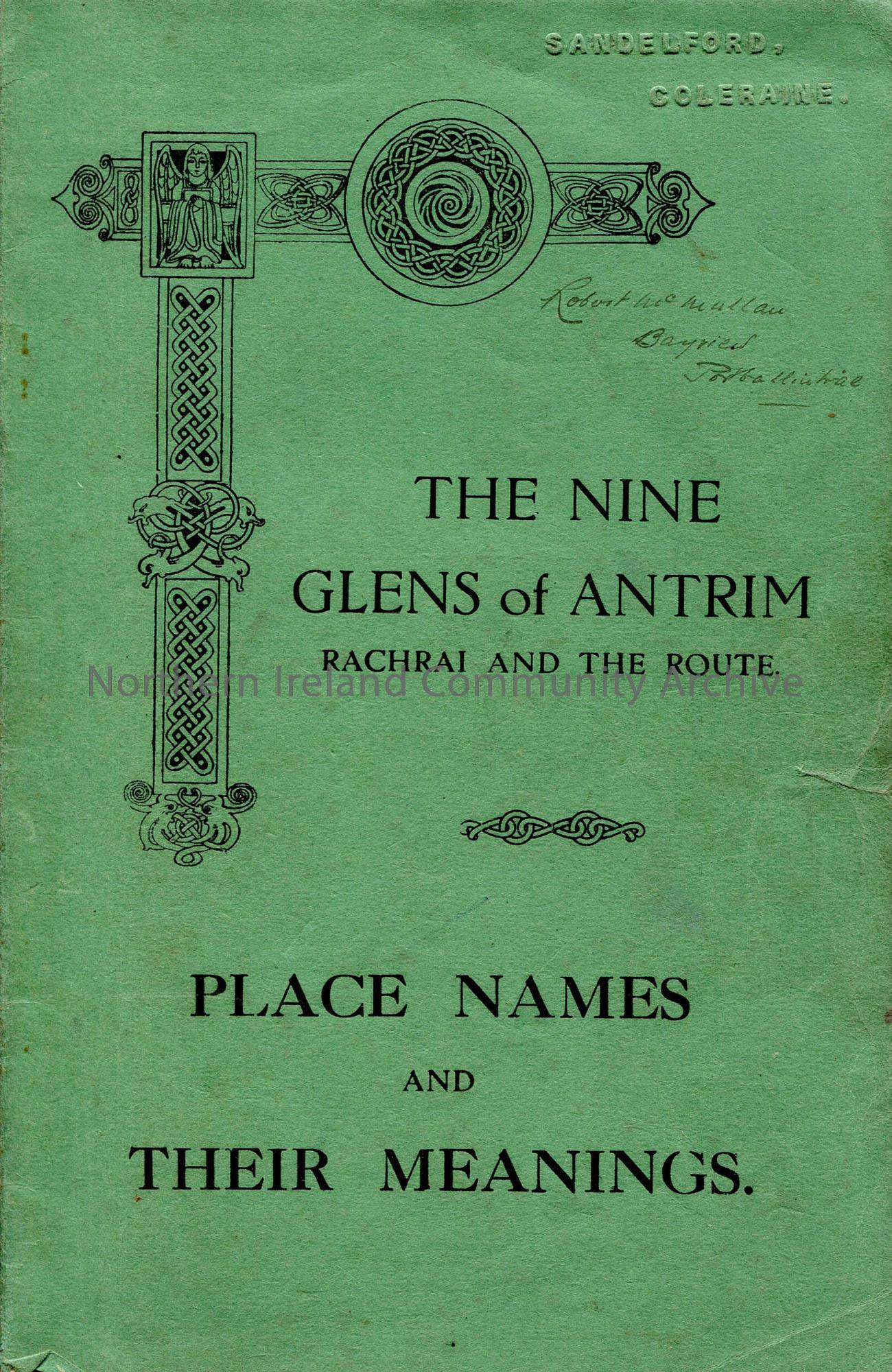 Booklet entitled 'The Nine Glens of Antrim Rachrai and The Route - Place Names and Their Meanings'. Foreword by F J Bigger. 3 columns - lists of anglicised form of name, Gaelic form and meaning. Typed list on paper affixed to frontispiece, which has 2 drawings by John Campbell. Handwritten notes on back of last page.
